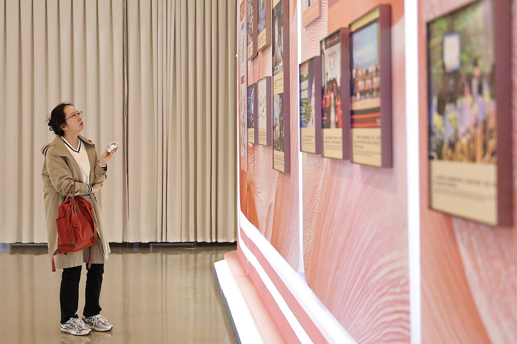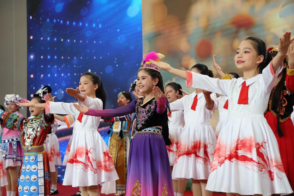 10月14日,春蕾梦想合唱团的孩子们在展览现场演唱《花开中国》。