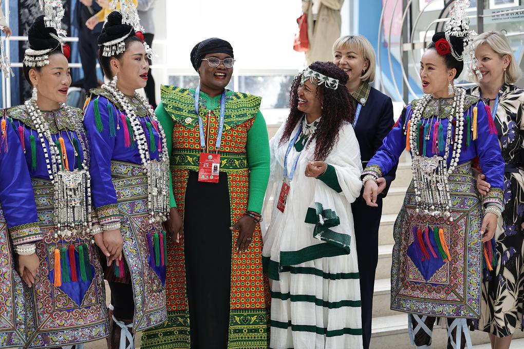 10月14日,来自坦桑尼亚等国的嘉宾在展览上与侗族大歌表演者互动。