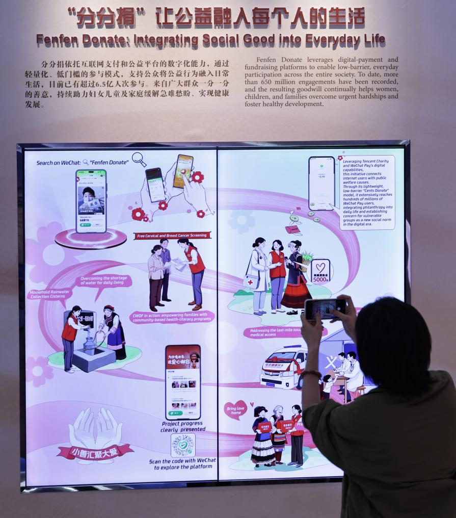 10月14日,全球妇女峰会参会嘉宾在展览上用手机拍摄公益项目展板。