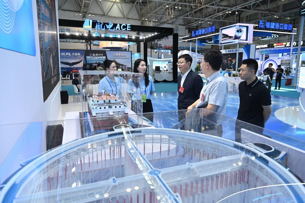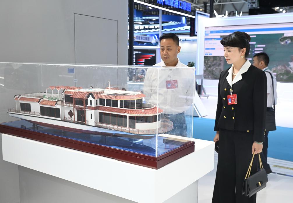 10月16日,与会人员在宁德时代展区观看“闽江会客厅”电动游船模型。