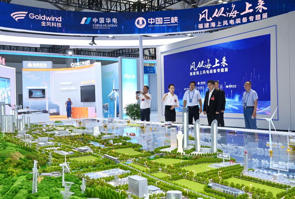 10月16日,与会人员在福建海洋装备产业链馆海上风电装备展区参观。