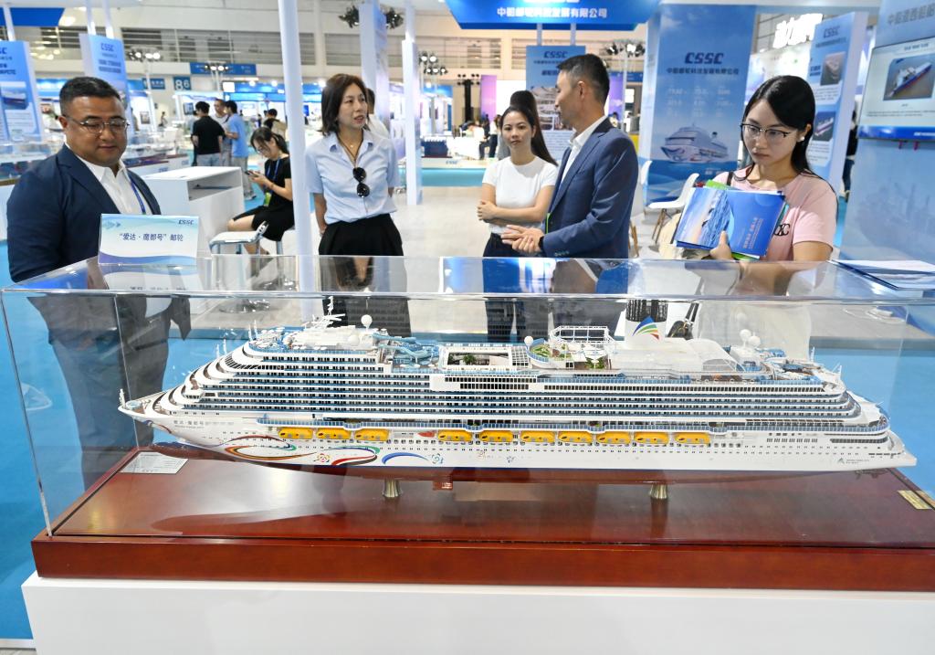 10月16日,与会人员在中国海洋装备博览会现场观看“爱达·魔都号”邮轮模型。