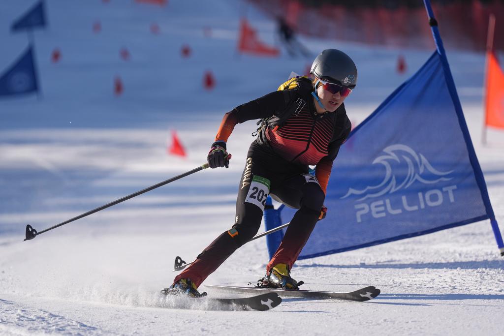 2025年12月16日,全国滑雪登山锦标赛短距离项目在吉林省吉林市中旅松花湖度假区举行。图为西藏队选手次旦玉珍在决赛中。最终,她获得专业组女子第二名。新华社记者 胡虎虎 摄