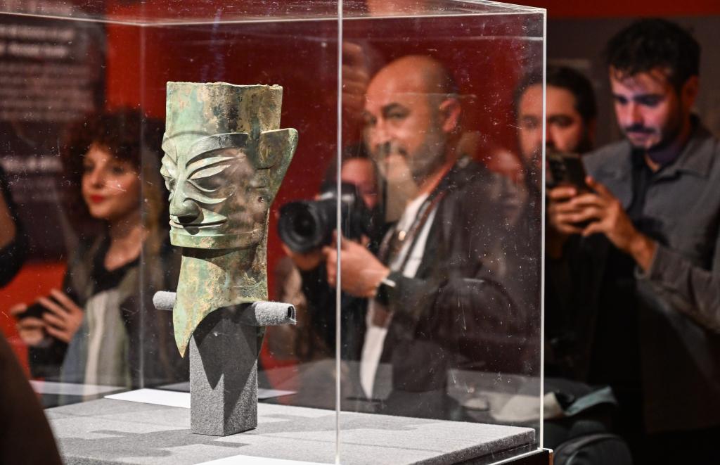 3月17日,在西班牙瓜达拉哈拉博物馆,人们参观中国西南地区青铜文明展上来自三星堆遗址的展品青铜人头像。