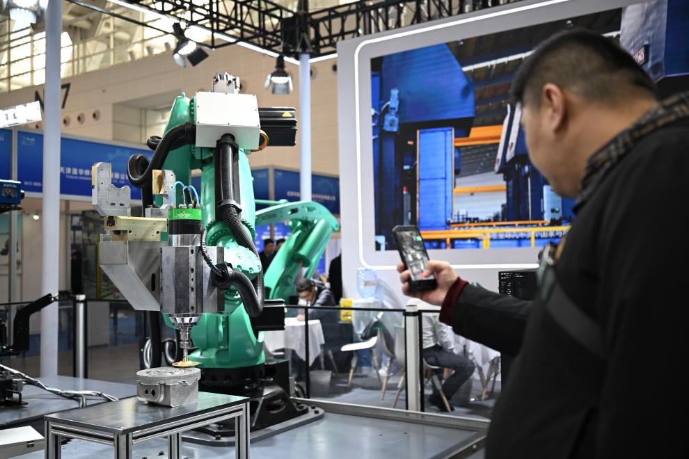 3月18日,观众在天津工博会上参观一款打磨工作站。