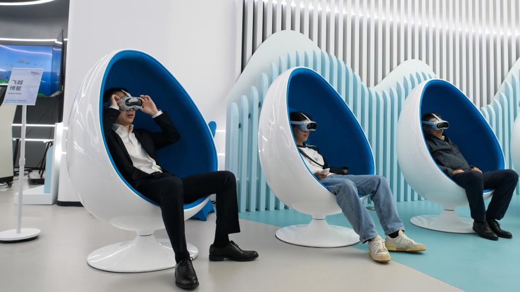 3月19日,观众在“一带一路”主题数字展上沉浸式体验“飞越博鳌”。