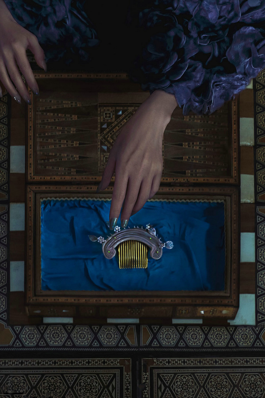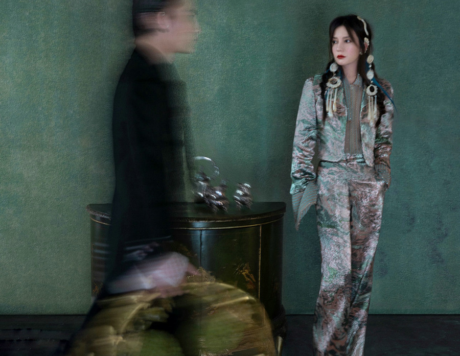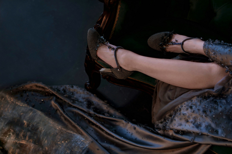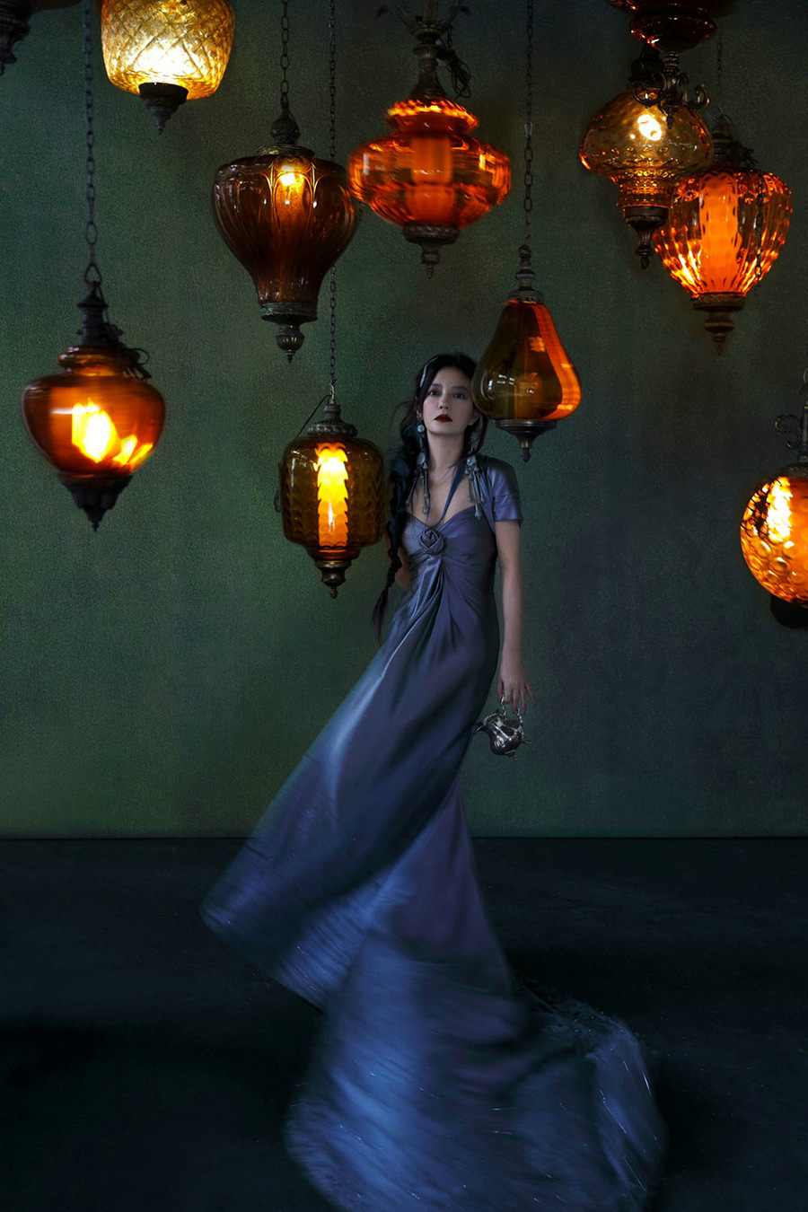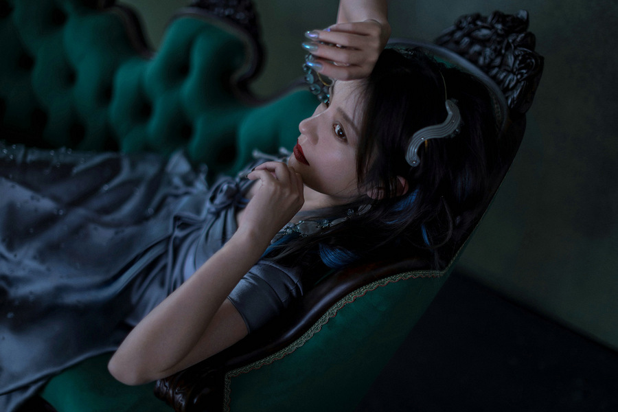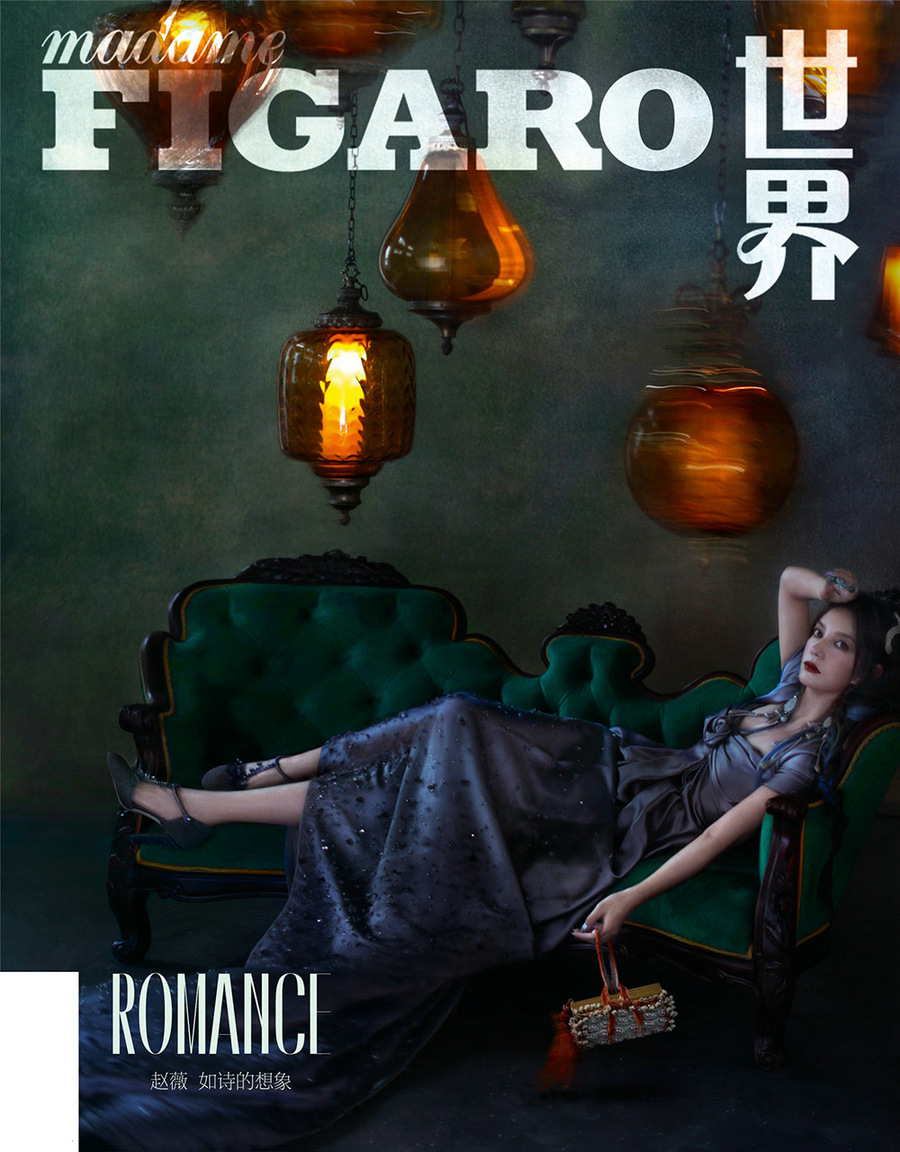 大片中,赵薇穿着高定礼服置身油画般的场景,或一身黑色蕾丝透视裙慵懒倚靠在椅背,似在等待晚宴开场;或身穿幽蓝色鱼尾长裙躺在墨绿色的长椅上回眸一望,露肩吊带长裙搭配繁花披肩,让人仿佛能闻到了暗夜中的悠然花香,画面氛围感十足。赵薇眼神清冷却又蕴含沉静的力量,在性感魅惑与高贵典雅间随意切换,时尚表现力十足。