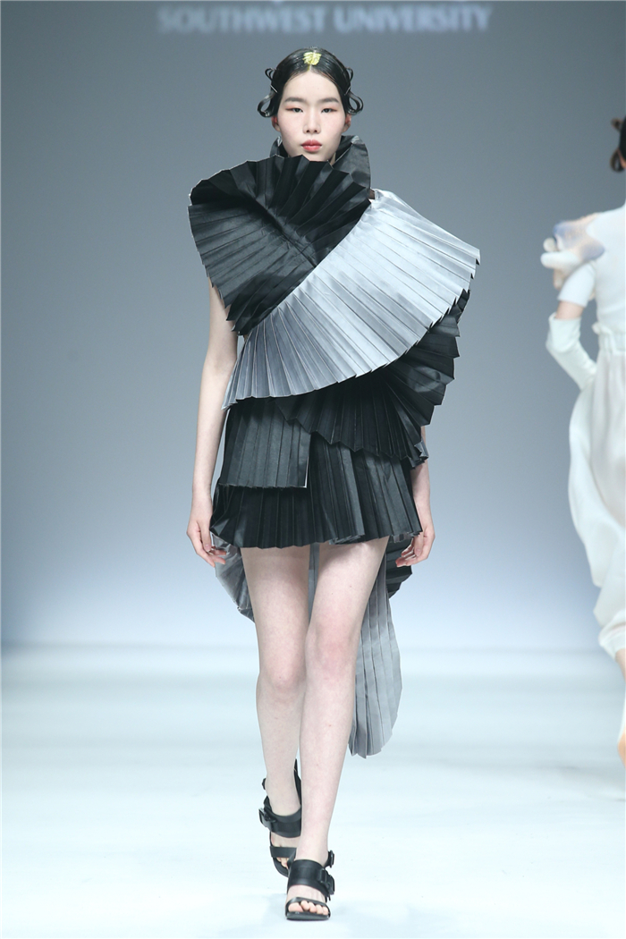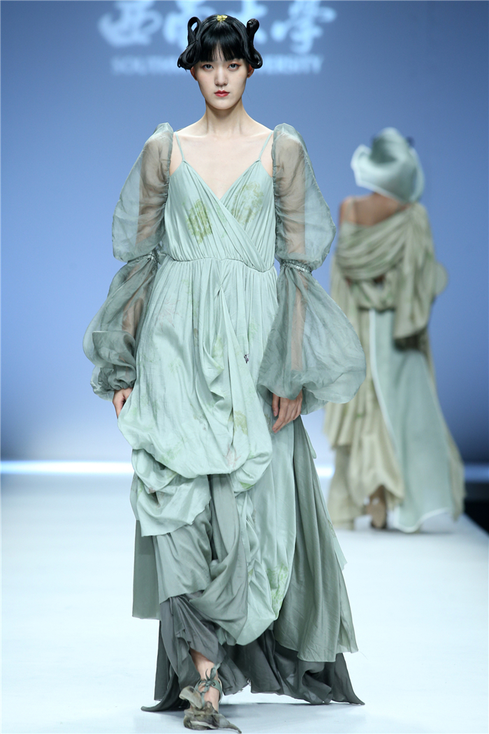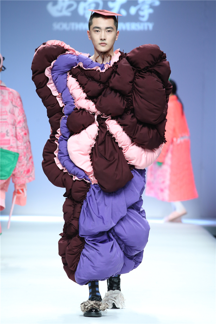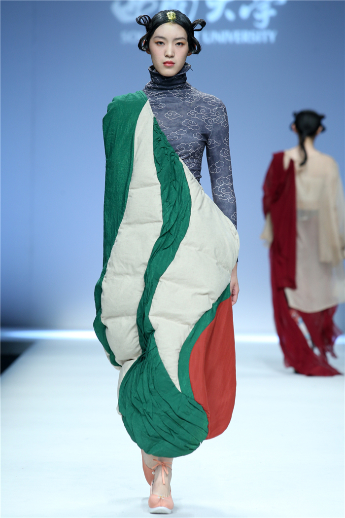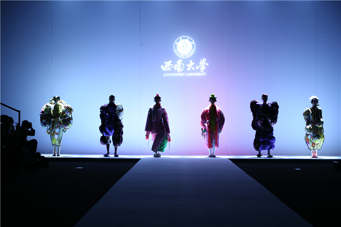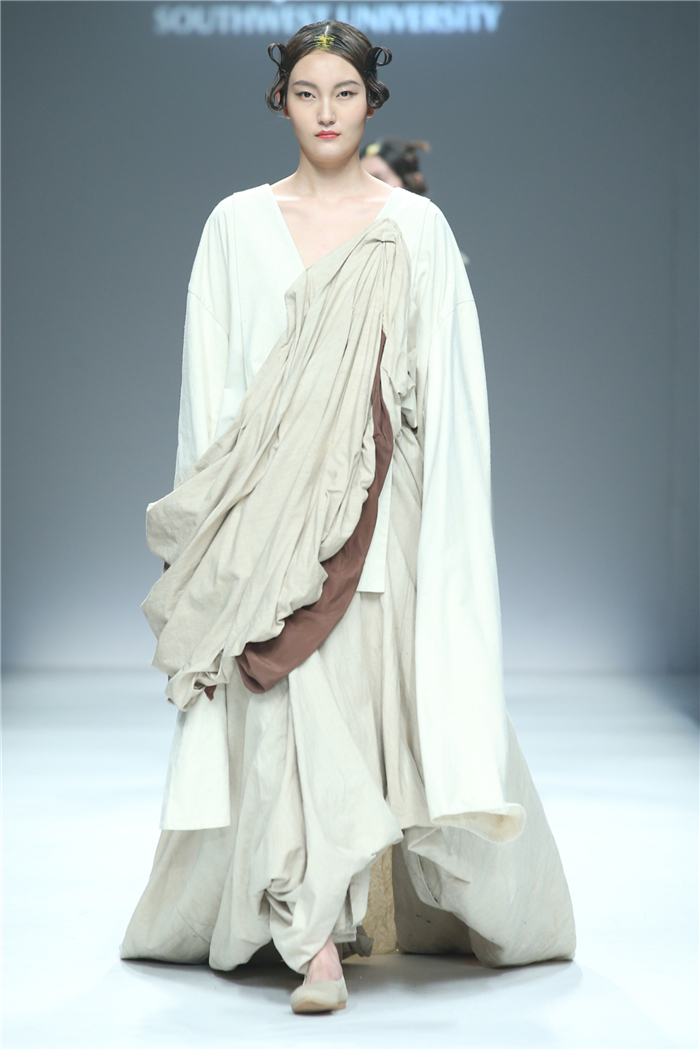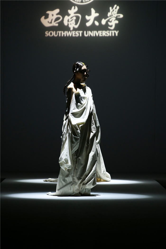 伐檀有人,莫及舟车;蚕桑未采,何来垂裳。对一个民族而言,服装不仅是一丝一缕的交织技艺,更是“求真尚美,砺志笃行”的坚守。百余年来,西南大学杏坛育人,劝课农桑,积淀了深厚的人文底蕴。西南大学蚕秉持“生生不息、经天纬地”的学院精神,励精图治,改革创新。本“茧,蚕衣也。衣者,依也。蚕不自其衣,而以其衣衣天下,此圣人之所取法也。”西南大学以“繭/Cocoon”为主题,基于服装的规范性,在多元化的创作构想、材料应用、色彩组合、科技融合中具有了超越性。由跨学科、跨文化、跨界延伸了“跨时尚”的概念,代表着西南大学蚕桑纺织与生物质科学学院,立足西南,心系天下。