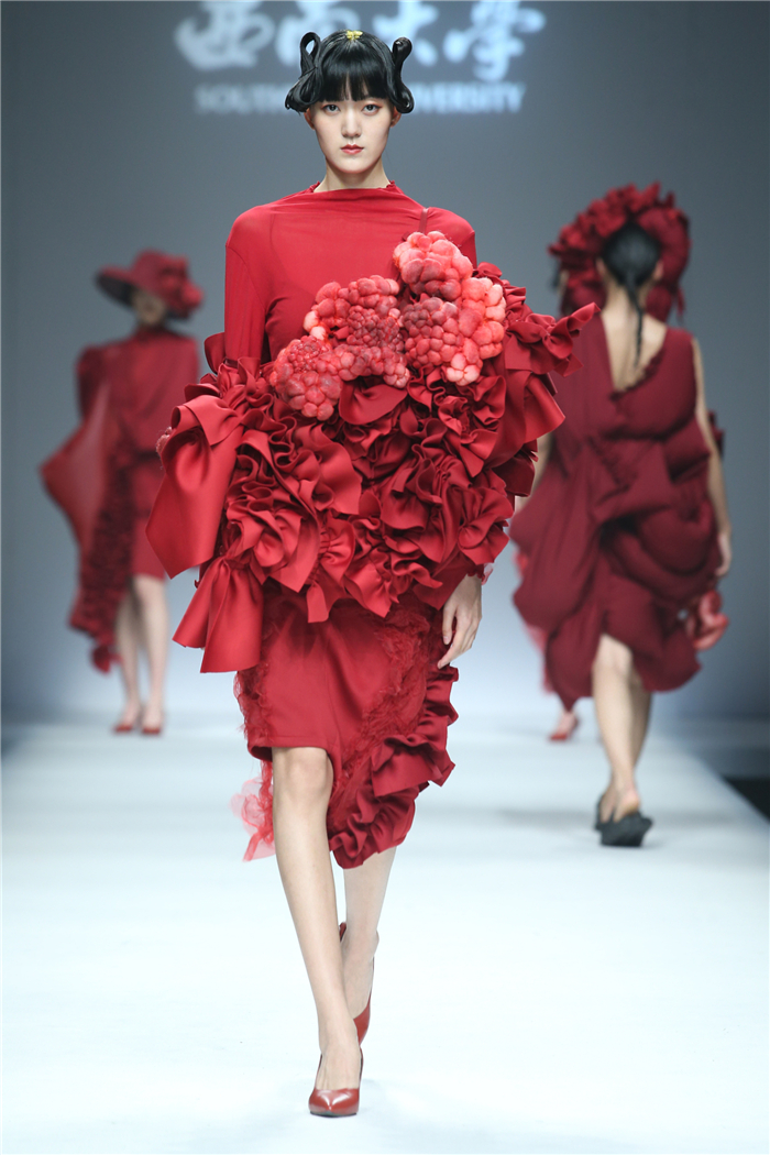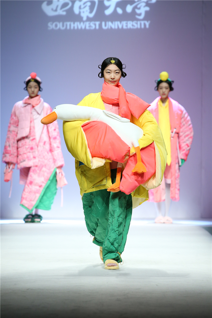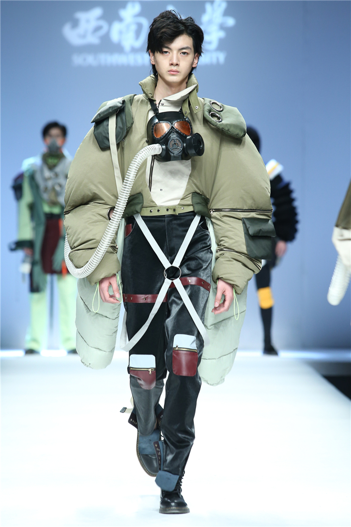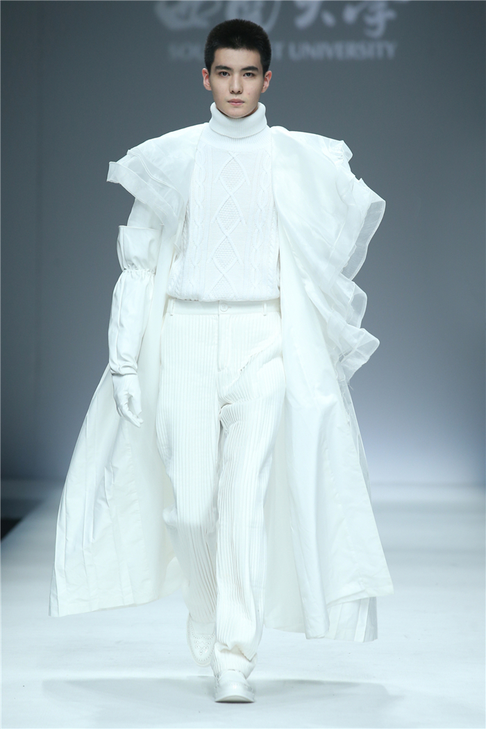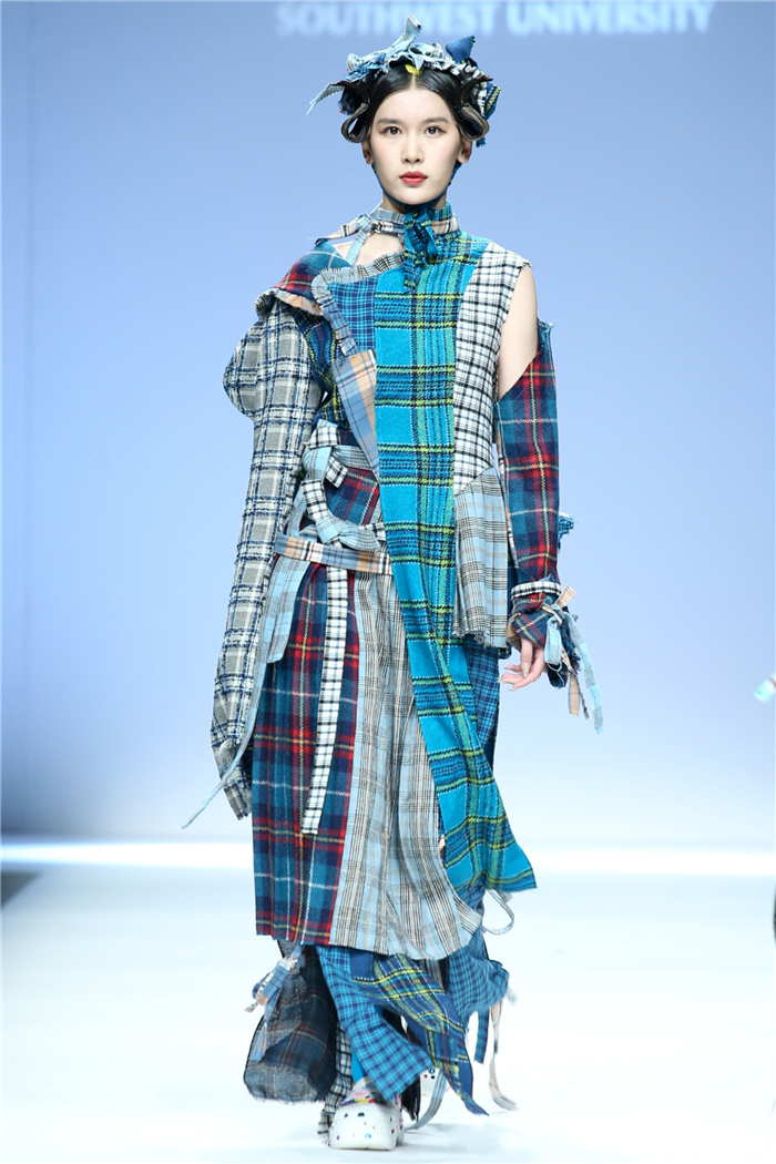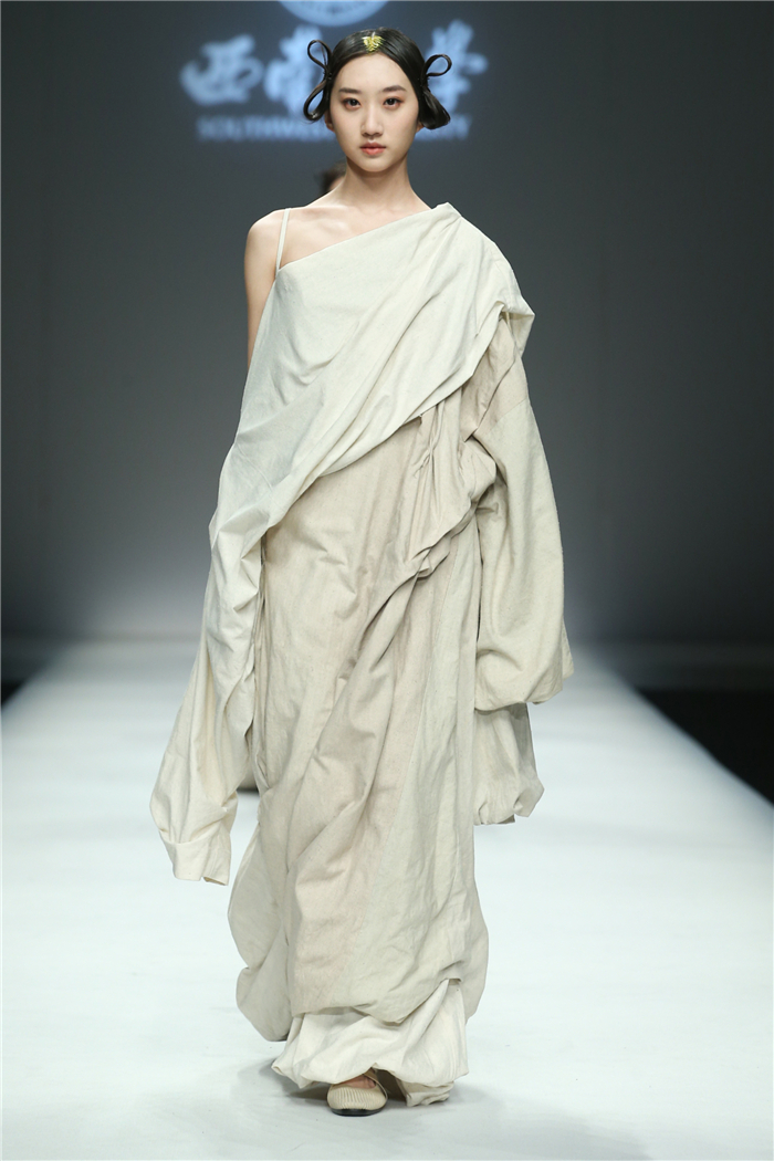 伐檀有人,莫及舟车;蚕桑未采,何来垂裳。对一个民族而言,服装不仅是一丝一缕的交织技艺,更是“求真尚美,砺志笃行”的坚守。百余年来,西南大学杏坛育人,劝课农桑,积淀了深厚的人文底蕴。西南大学蚕秉持“生生不息、经天纬地”的学院精神,励精图治,改革创新。本“茧,蚕衣也。衣者,依也。蚕不自其衣,而以其衣衣天下,此圣人之所取法也。”西南大学以“繭/Cocoon”为主题,基于服装的规范性,在多元化的创作构想、材料应用、色彩组合、科技融合中具有了超越性。由跨学科、跨文化、跨界延伸了“跨时尚”的概念,代表着西南大学蚕桑纺织与生物质科学学院,立足西南,心系天下。