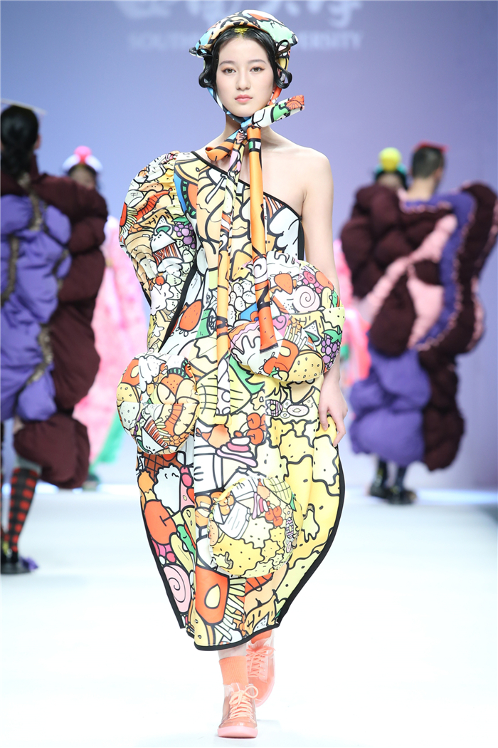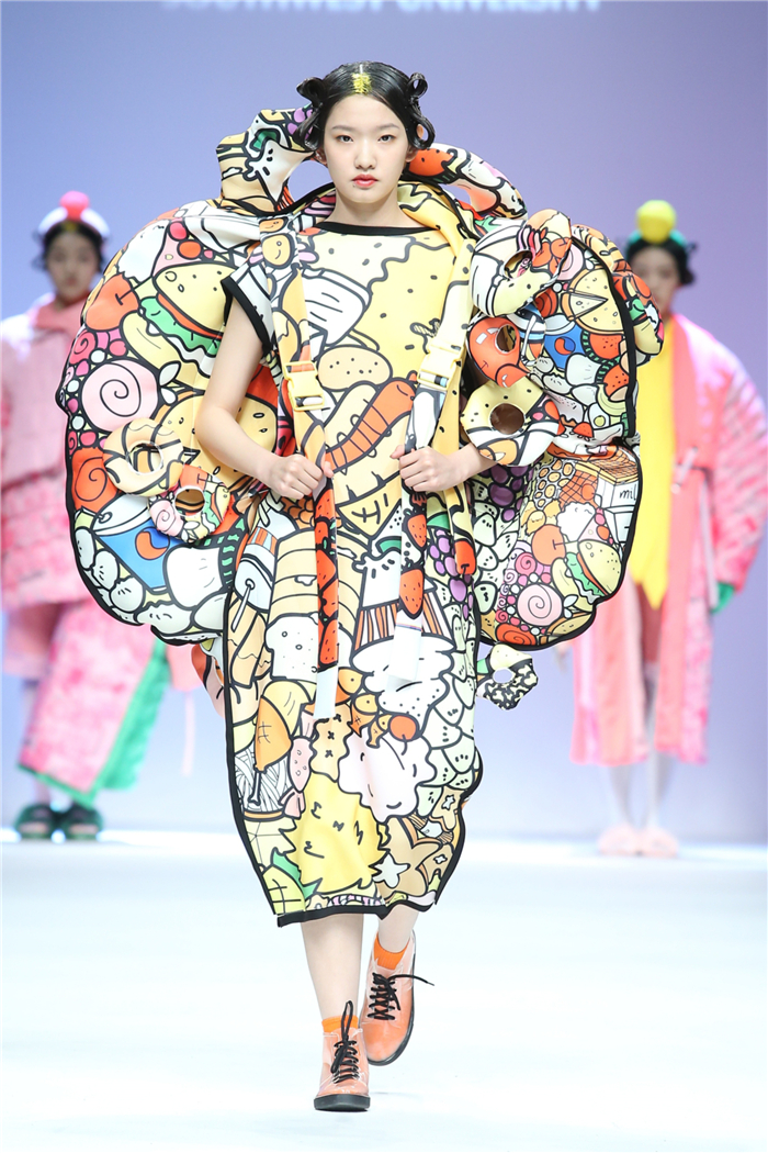 本届毕业设计分为三个部分:逸趣,以多样化的图案色彩搭配宣示当代年轻人追求多元,玩味童心的设计态度;娴雅,以灵动雅致的裁剪温润柔和的搭配代表新一代时尚人超凡的审美品位;丝茧,以丝为媒以茧为意彰显当代大学生关注传统文化拥有较高的文化素养。