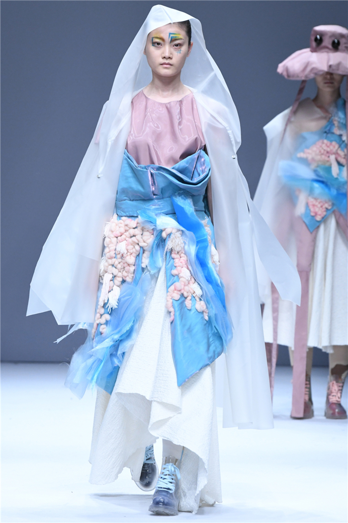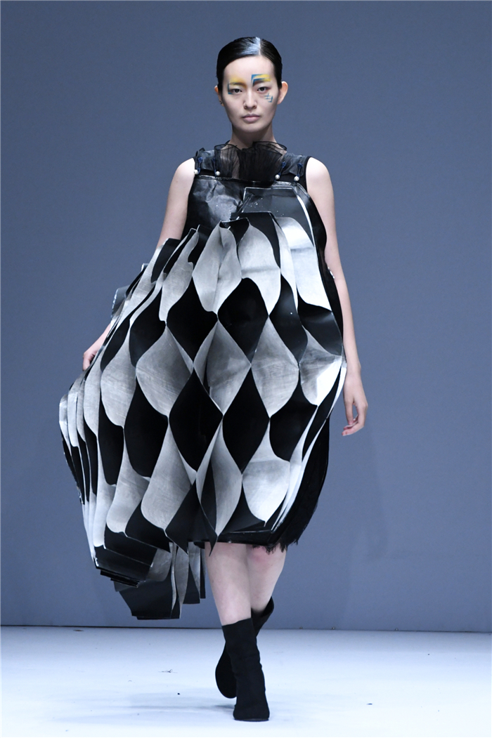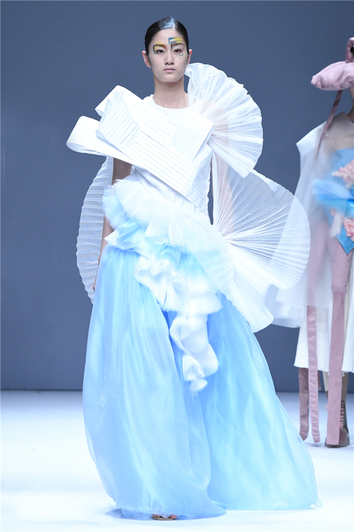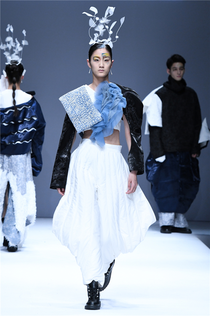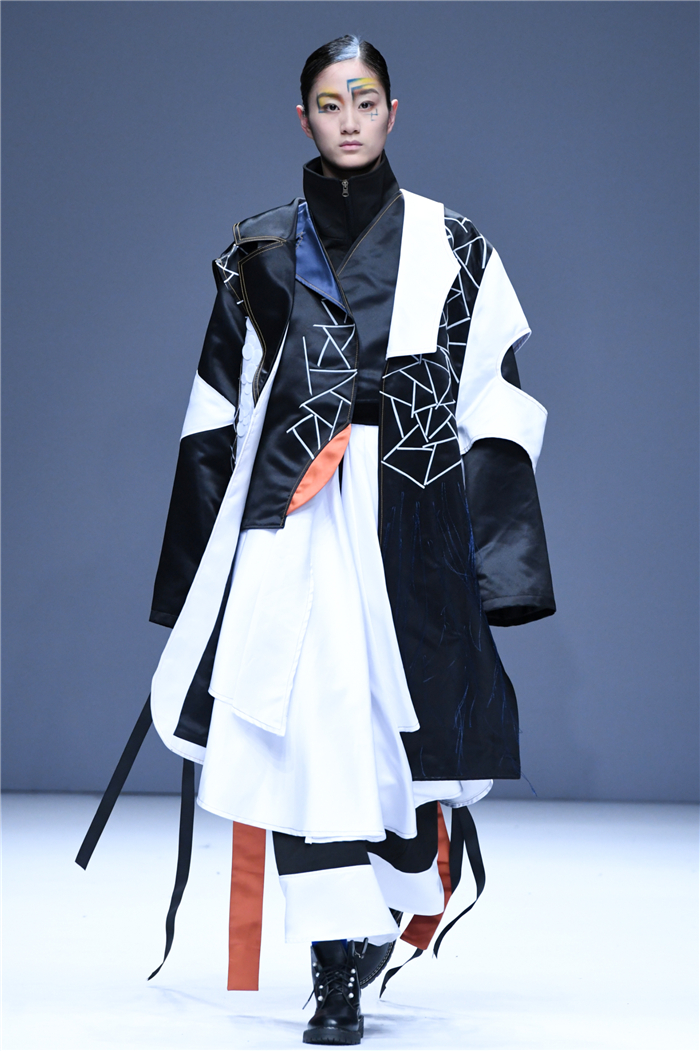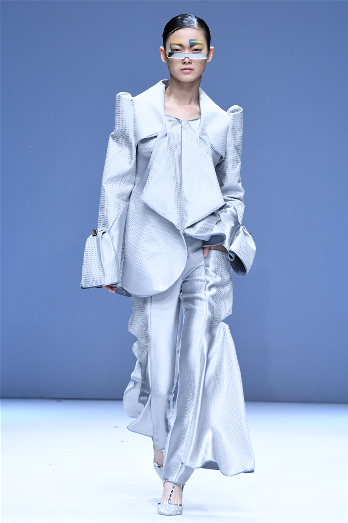 天马行空的创意,包罗万象的灵感,五彩斑斓的霓裳,在这里年轻的学生设计师们用服装语言诠释了对主题的认识,审视现在、憧憬未来,展现富有表现力和创造性的时尚元素,在造型设计和概念性装饰方面、在材料多元的搭配组合应用方面、在解构设计手法创新等诸多方面都有可喜的突破和大胆尝试。创意十足的立体裁剪、独居匠心的面料改造、精湛绝伦的缝制工艺,让整个T台绽放出无界之美。