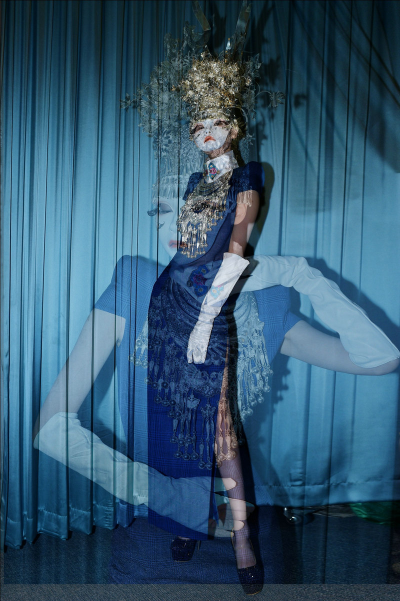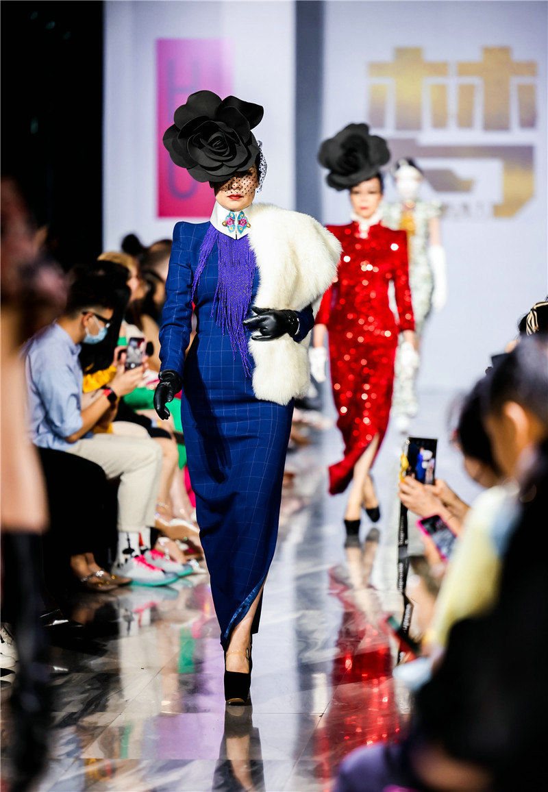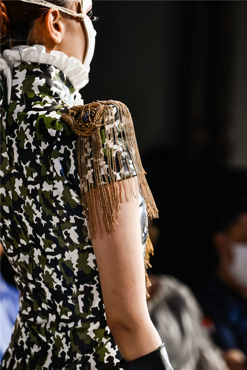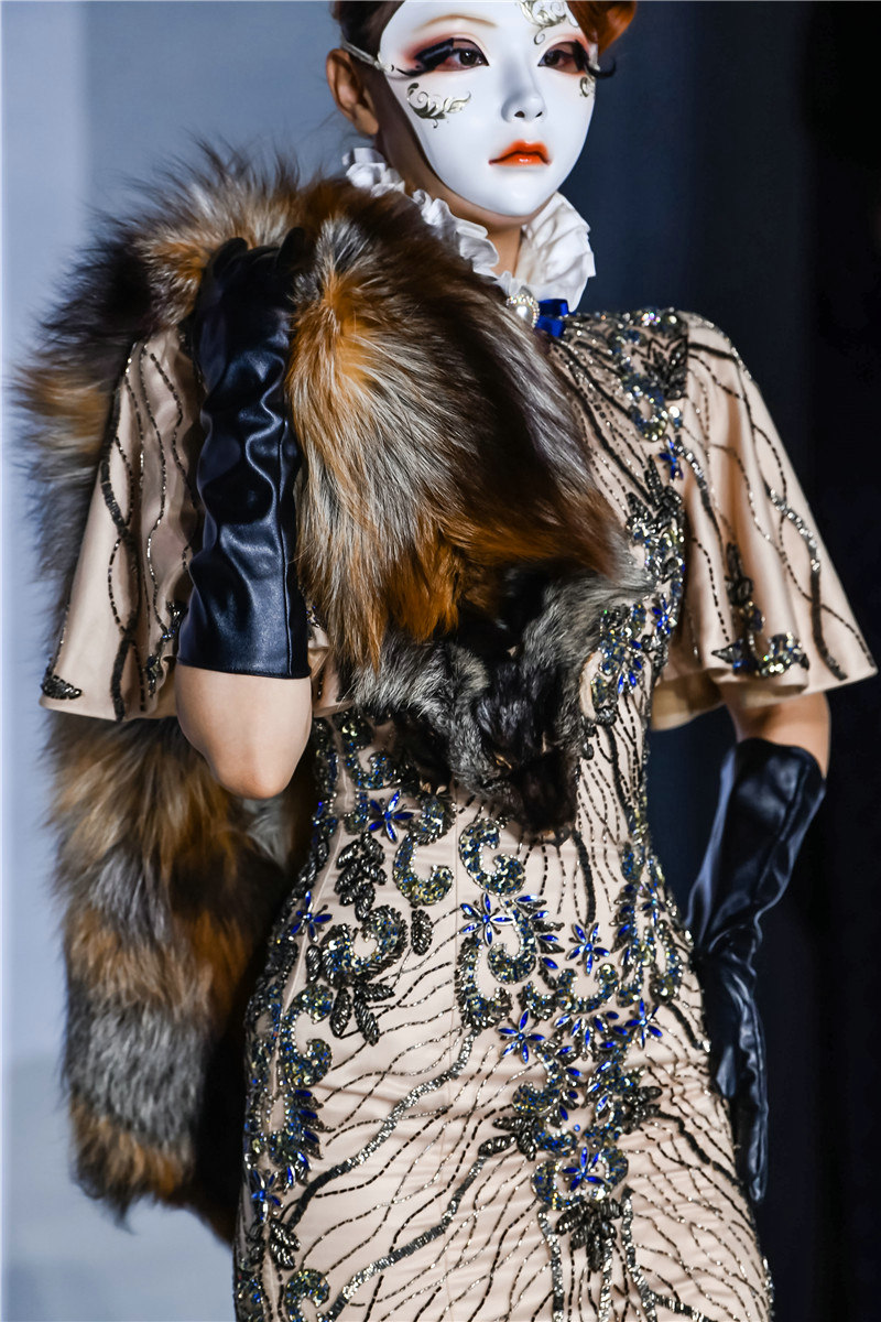 在“梦”系列高级定制旗袍里,你可以找到精湛刺绣、流苏、盘扣、钉珠镶嵌等东方元素。旗袍的面料选用了不限于巴洛克风格蕾丝、珠光锦缎、西装面料、仿皮草、硬挺印花皮革等,将金属链条、蟒蛇纹、亮片、金箔纸大面积进行点缀,高挑的俏肩设计修饰了整个廓型,利用隐形拉索改良了盘扣固定方式,避免了露出底布的尴尬,节省了穿着者对手臂压力,故意放低开叉的位置,解放了女性穿着旗袍坐下时的尴尬。