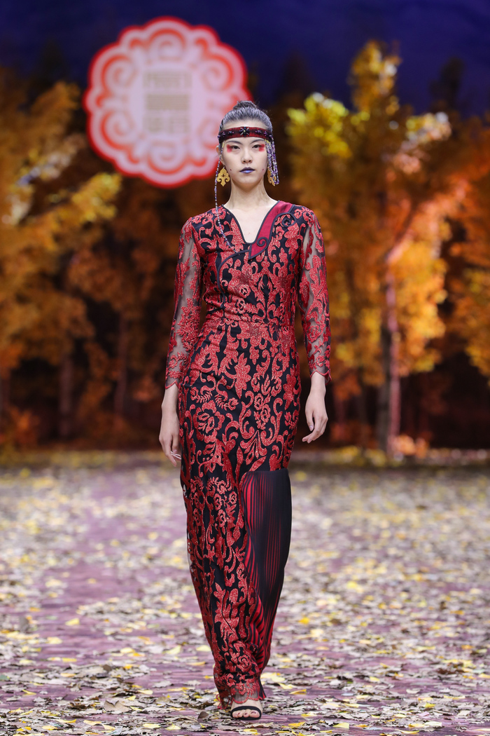 在鄂伦春族采风中,金景怡深入“最后一支狩猎民族”的生活情境,体会到他们对自然、对山河的敬仰和虔诚,在鄂伦春族非遗传承人的言传身授中提炼出兽皮制作、镶补刺绣的美学特点,结合民族元素与传统技艺,将古老文明的张力裁入现代时尚,既有借丝线著史,记载古时代鄂伦春人狩猎历史的用心,又有守护森林原野,歌颂新时代鄂伦春人与大自然和谐共生的新意。
