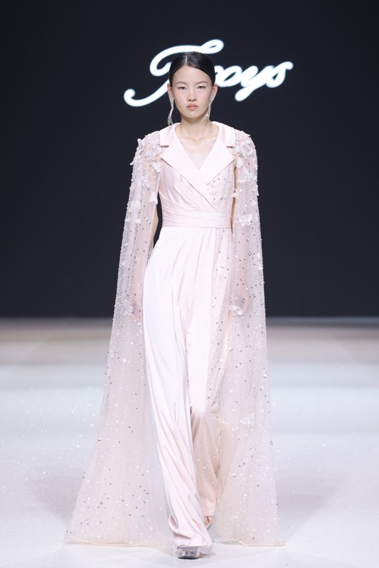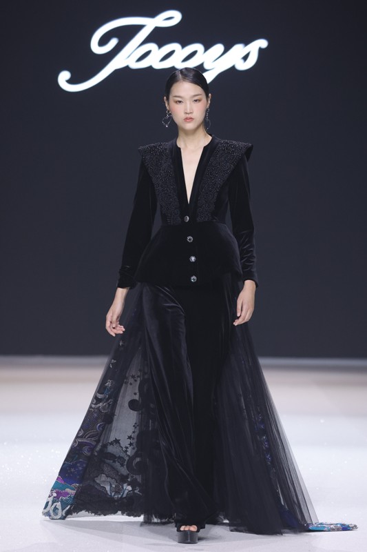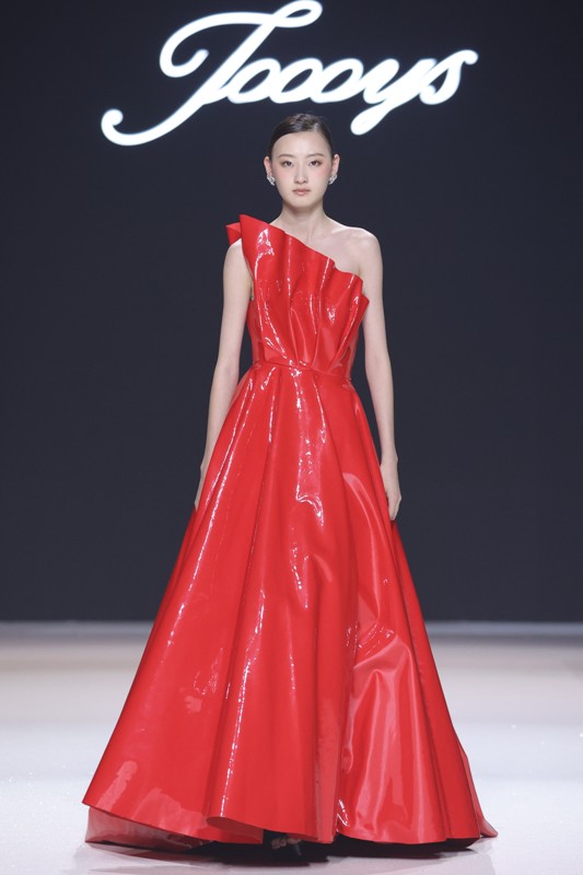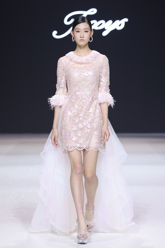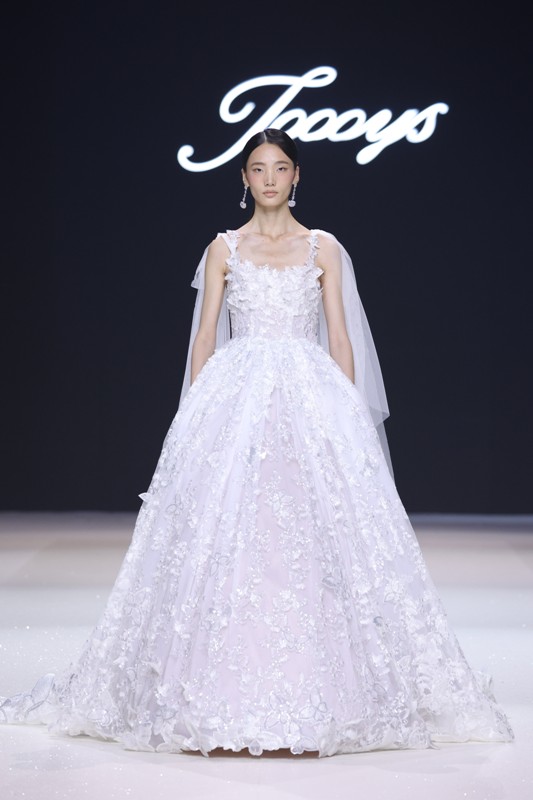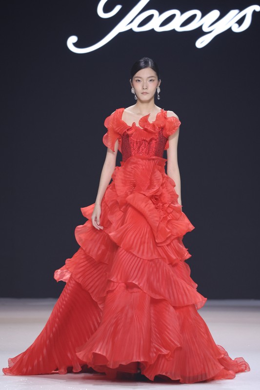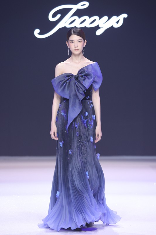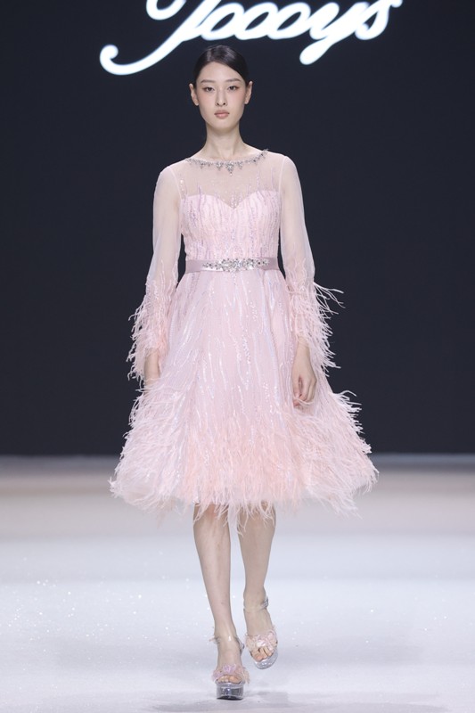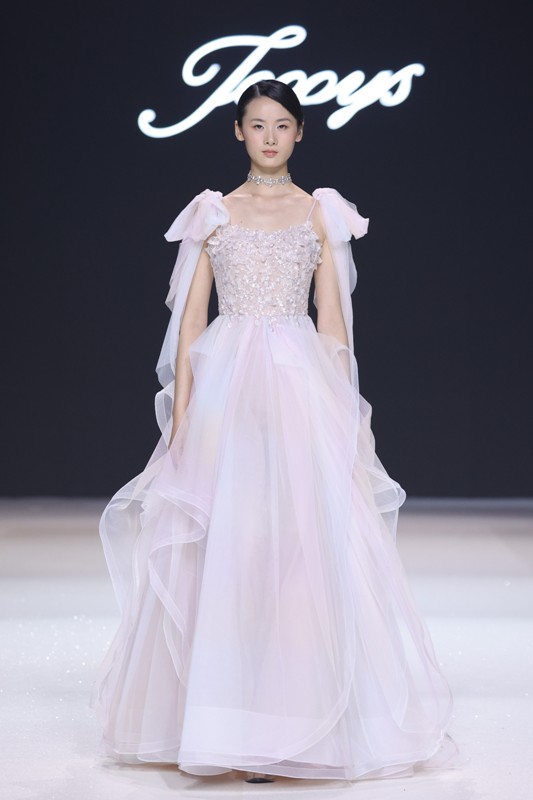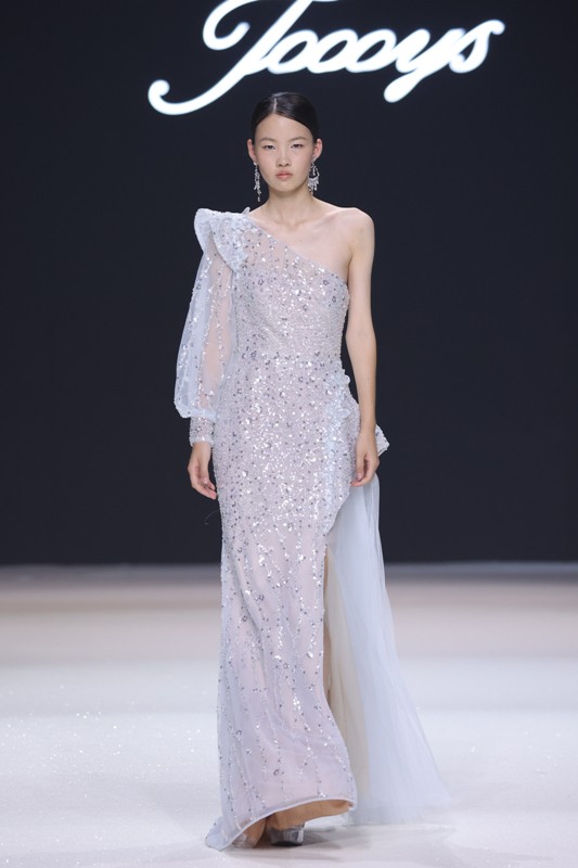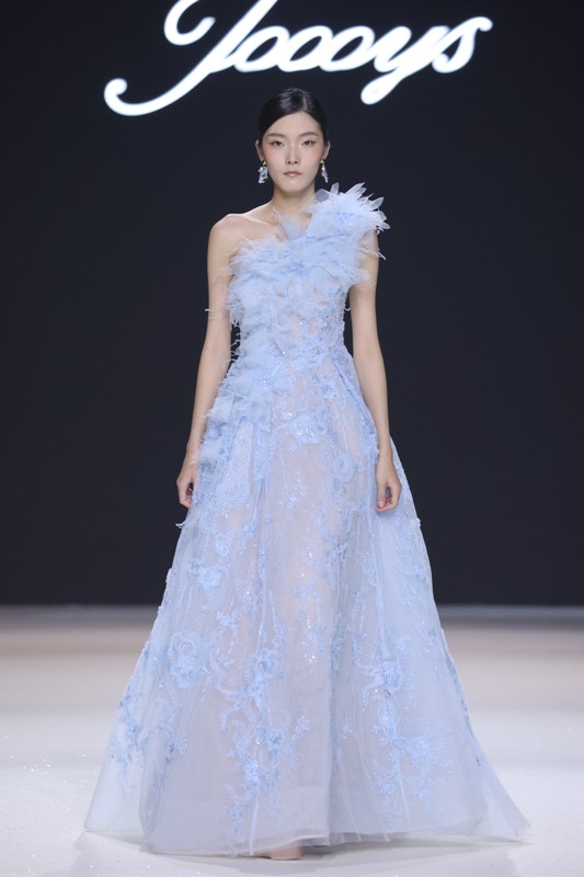 大秀现场被打造成一个流光溢彩的梦幻世界,本季共呈现40套精美的华服,并全部由东方宾利旗下众多一线名模倾情演绎,一群美丽的女孩从插画中依次走出,如在逃公主般高贵迷人,如精灵般神秘美丽,如仙子般美轮美奂,如女神般傲视万物。品牌对于工艺的极致运用,在本季也得到了淋漓尽致的展现,画中的梦幻色彩、精巧图形、灵动笔触都被赋予了立体的生命。亮丽优雅的配色,奠定了整个系列柔和唯美又浪漫积极的调性;传统丝绸和现代科技面料的交织,垂坠飘逸又富于光泽,既承载了设计的巧思,又塑造了服装的质感;插画中的繁花枝蔓,则通过刺绣、手工绣珠、烫钻、镂空等工艺演绎在服装上,同时,羽毛和水晶的加入也丰富着服装的精致细节;结构方面,本季继续沿用品牌标志性的立体剪裁,廓形变化贴合人体,拖尾滑轮的运用对人体起到减负的作用,穿着体验的舒适度又再次升级,发光纤维的运用令婚纱更加梦幻灵动。总之,JOOOYS 2022春夏系列兼具奢华的美感和极高的性价比,充满了摩登的格调。