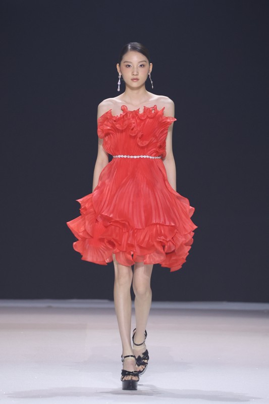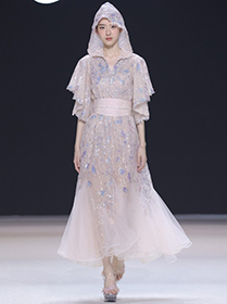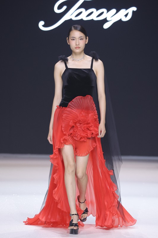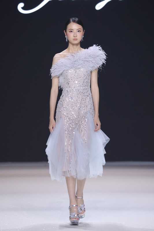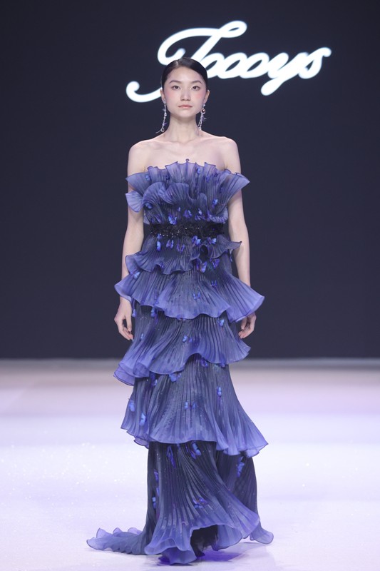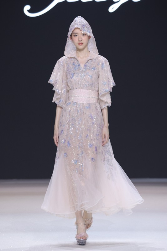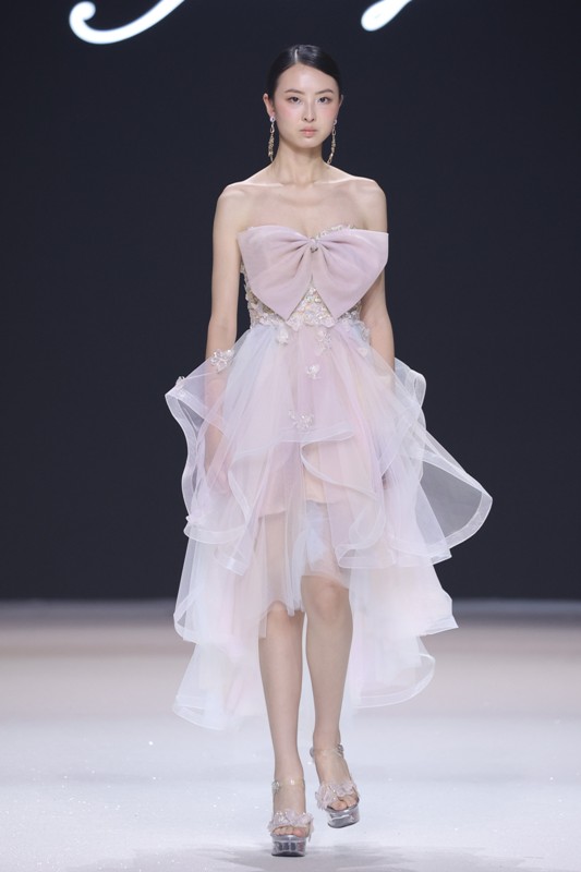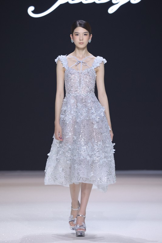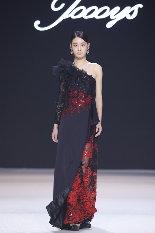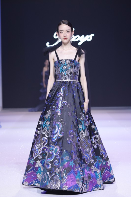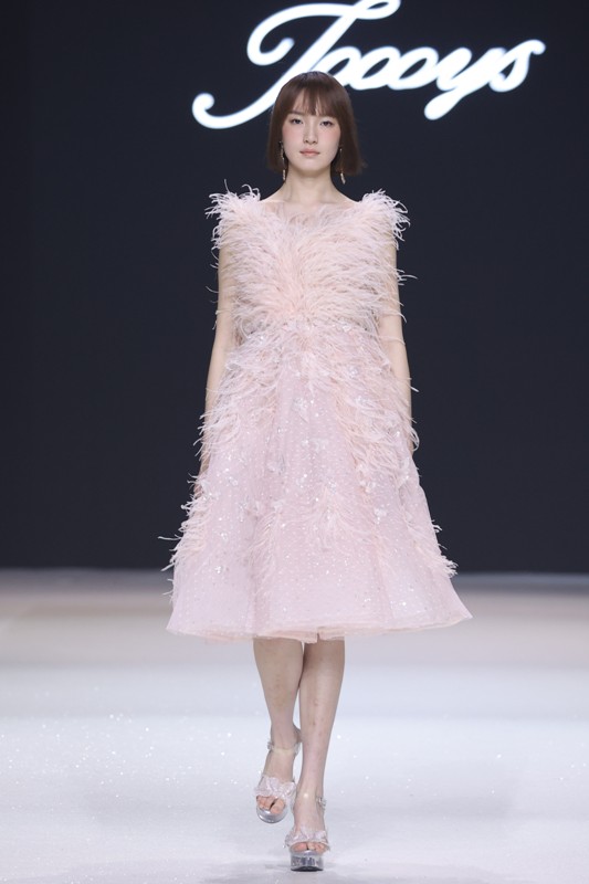 大秀现场被打造成一个流光溢彩的梦幻世界,本季共呈现40套精美的华服,并全部由东方宾利旗下众多一线名模倾情演绎,一群美丽的女孩从插画中依次走出,如在逃公主般高贵迷人,如精灵般神秘美丽,如仙子般美轮美奂,如女神般傲视万物。品牌对于工艺的极致运用,在本季也得到了淋漓尽致的展现,画中的梦幻色彩、精巧图形、灵动笔触都被赋予了立体的生命。亮丽优雅的配色,奠定了整个系列柔和唯美又浪漫积极的调性;传统丝绸和现代科技面料的交织,垂坠飘逸又富于光泽,既承载了设计的巧思,又塑造了服装的质感;插画中的繁花枝蔓,则通过刺绣、手工绣珠、烫钻、镂空等工艺演绎在服装上,同时,羽毛和水晶的加入也丰富着服装的精致细节;结构方面,本季继续沿用品牌标志性的立体剪裁,廓形变化贴合人体,拖尾滑轮的运用对人体起到减负的作用,穿着体验的舒适度又再次升级,发光纤维的运用令婚纱更加梦幻灵动。总之,JOOOYS 2022春夏系列兼具奢华的美感和极高的性价比,充满了摩登的格调。