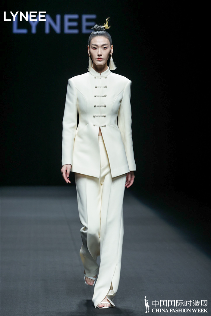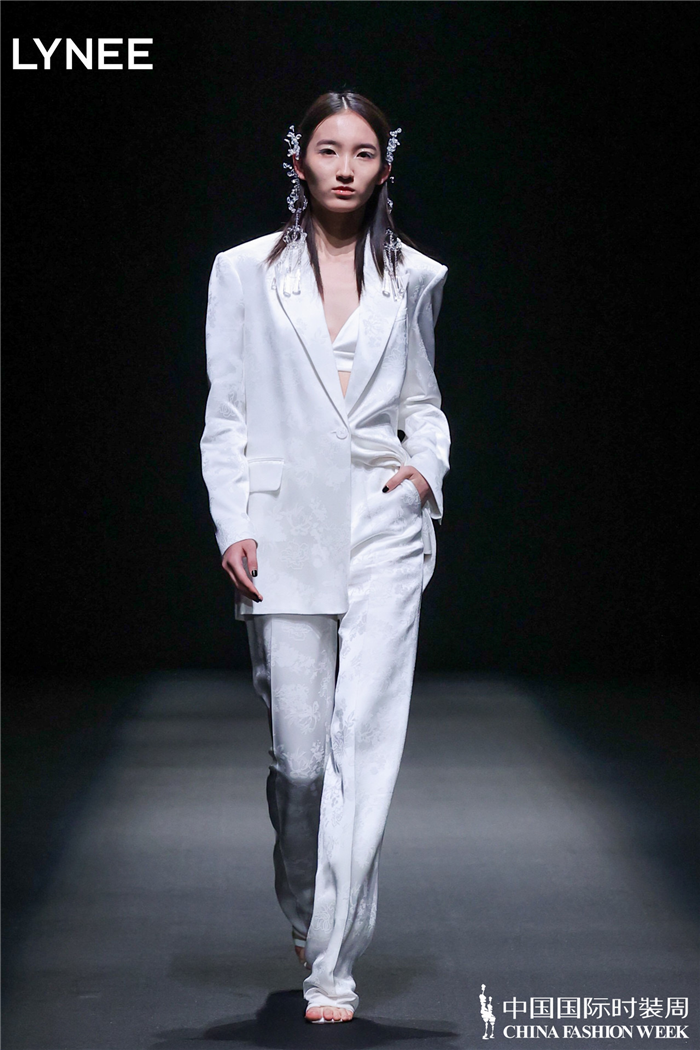 色彩方面,本系列以霜白为主,辅助以黑色、大地色为过度,融汇复古祖母绿,让整体色调回归中性;并通过特色提花、盘花等多种形式将充满质感的面料用东方写意的手法来表现,搭配上传统中古配饰及夸张盘发,传递出文化碰撞的和谐美感,加重了设计感和文艺气息。