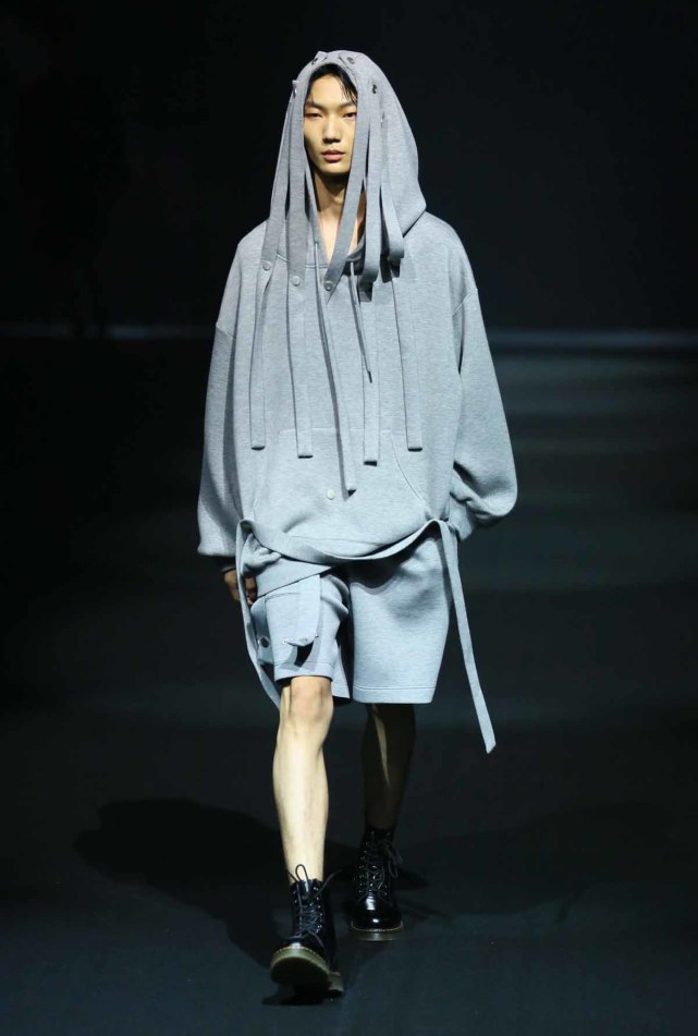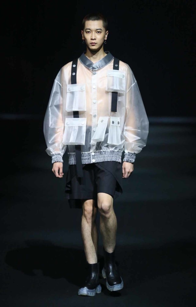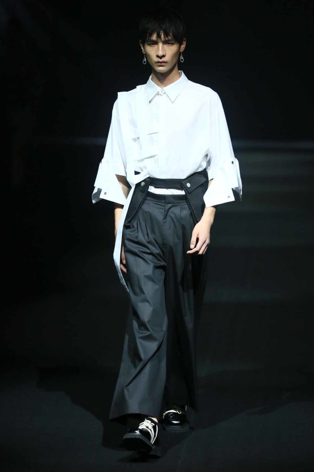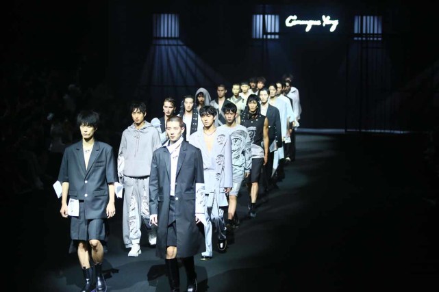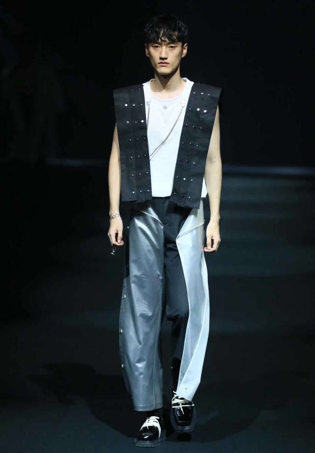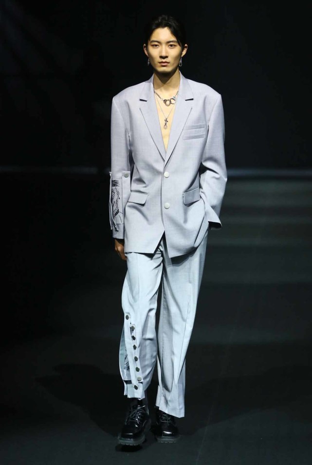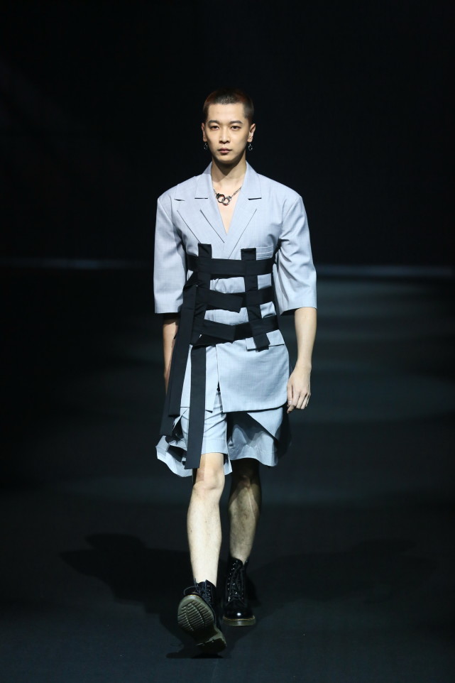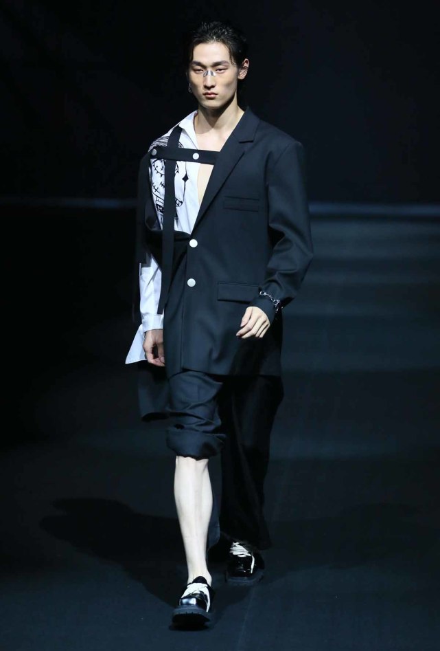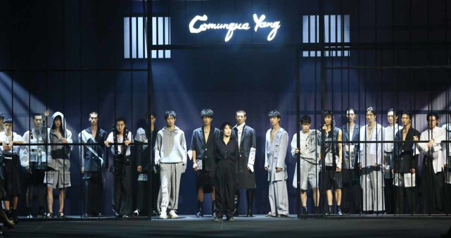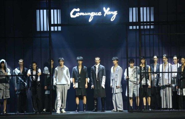 本场大秀由东方宾利全程制作打造,本季呈现的37套男装作品,继续由东方宾利名模军团倾情演绎,当模特在T台上的“囚笼”装置中穿行而过,服装上那些意味深长的细节也被逐一展现。和前两季相比,本系列显示出杨紫琪设计理念和技法的丰富与成熟:色彩上,本季沿用了原有的黑白灰,看似简洁单调实则蕴含内在的张力;面料上,本季除了保留男装高档西服毛料之外,也加入了雾面哑光透明质地的PVC,用材质的朦胧感暗喻迷茫的处境;辅料上,大面积选用了金属质感的四合扣,给人一种冰冷禁锢的感受;而作品里多次出现的绣花图案则是本季最大的亮点所在,这出自一位7岁孩童天马行空的手稿,借以表达附着于服装之上的自由灵魂再合适不过了。