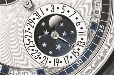 在某知名品牌的官网上,记者对比了同一款手表的经典大三针日历款表盘以及带月相功能的表盘,后者价格只增加了不到10%。“这两个表盘,我一定会选择后者。”时装编辑阿Sa在接受采访时说道,“从搭配的角度来说,增加一点小小的细节,表现力就完全不一样了。”这便是月相在当下使用场景中的最大价值之一:高性价比,以及不可小视的造型能力。实际上,作为入门级的复杂功能,品牌在月相表上注入了相当多的艺术巧思,例如宝珀的月相表盘就以极具辨识度的“月亮美人”表情,为手表带来了一丝灵动。