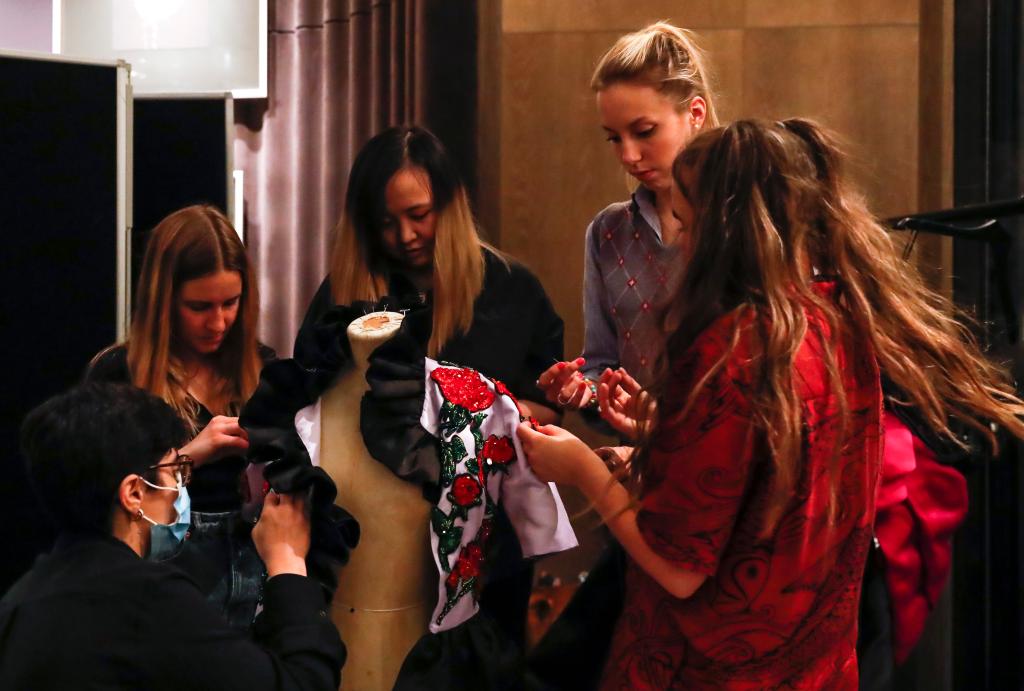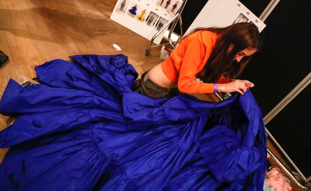 9月21日,工作人员在英国伦敦时装周后台准备走秀服装。 新华社记者 韩岩 摄pagebreak
