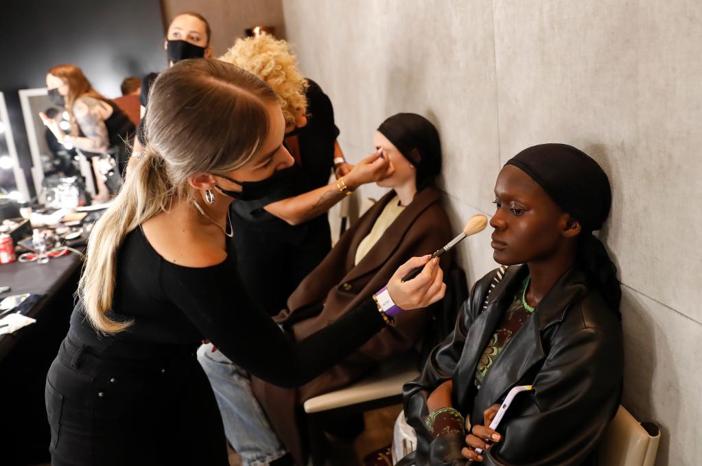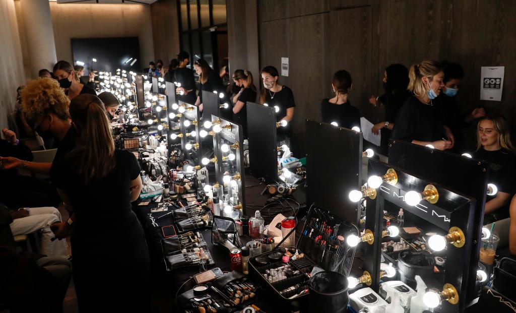 9月21日,模特、造型师等在英国伦敦时装周后台为理查德·奎因品牌走秀做准备。 新华社记者 韩岩 摄pagebreak