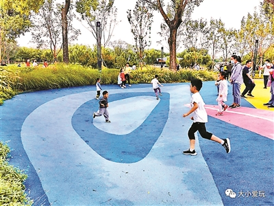 这里还贴心地画出了两条100米的赛道,连起步时的脚位都标出来了,小朋友可以在这比赛跑,回学校拿个100米跑的好成绩!这样的设置还是第一次在公园里见到,让人觉得新鲜又好玩。