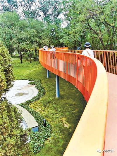 除了摩天轮,空中步道是另一处必打卡的景观,渐变的廊桥如一条丝带,随意地落在了树林间,上去走一走,小风吹得很清凉,视野更开阔。
