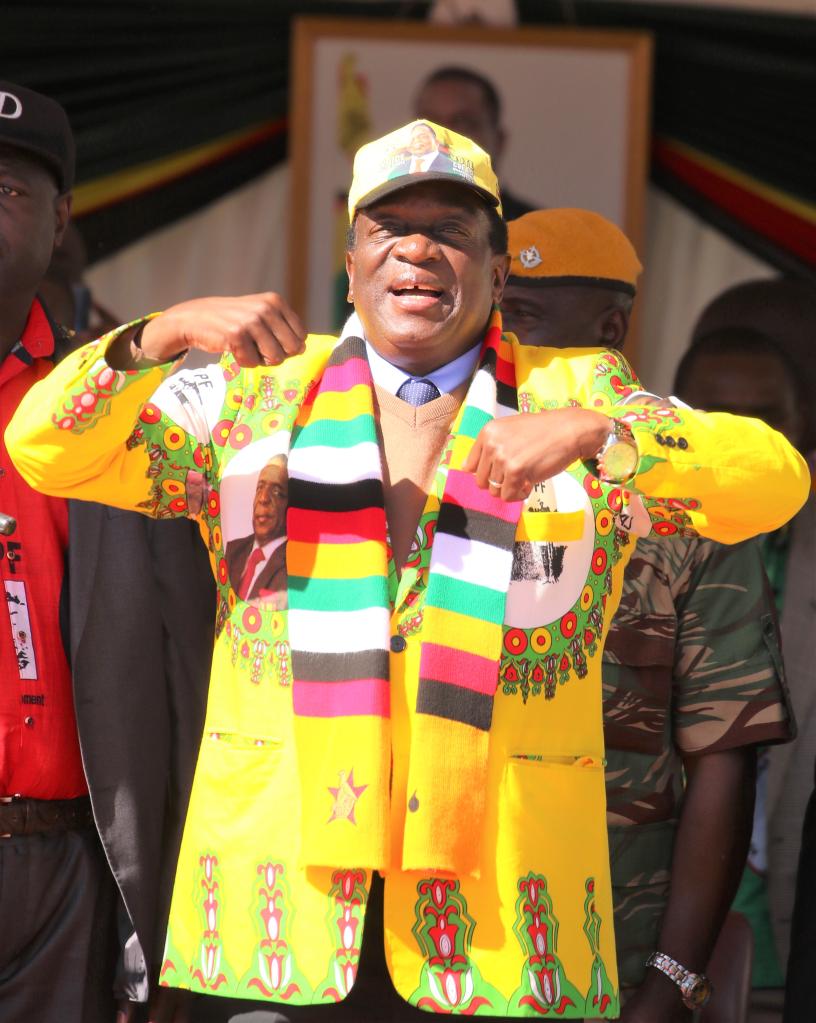 2018年7月21日,津巴布韦总统姆南加古瓦身着花布做成的西装出席竞选活动。新华社发(肖恩·朱萨摄)