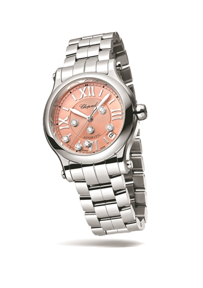 萧邦全新Happy Sport系列腕表:表盘上的灵动钻石,自由且生动。腕表配备内含自动上链机芯的36毫米表壳,搭配兼具温暖色调与精致质感于一体的金属表链。