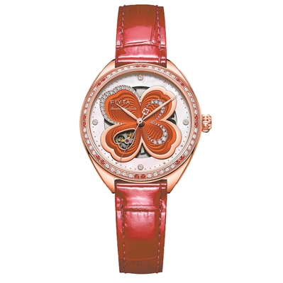 飞亚达表四叶草系列“中国红”女士机械腕表:融合真钻与天然珍珠贝母材质与冷珐琅工艺,点染万种风情的东方瑞色,寓意红运永驻。