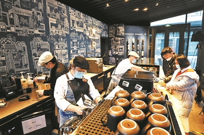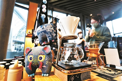 “印象中的星巴克都是绿色的,我第一次来的时候感觉很震撼,这家店吊顶、展柜和墙面都是蓝色的,将传统蜡染艺术和咖啡巧妙结合。我们经常需要一杯‘还魂水’提提神,让年轻人喝咖啡的同时还能更多了解我国的非物质文化遗产,感觉很有意义。”90后消费者苏女士说,自己从事文化创意工作,需要到各处经常找灵感,而疫情期间很难出京,这家门店时常让她可以放空大脑,她甚至经常把小组办公会搬到这里,让大家都充充电。