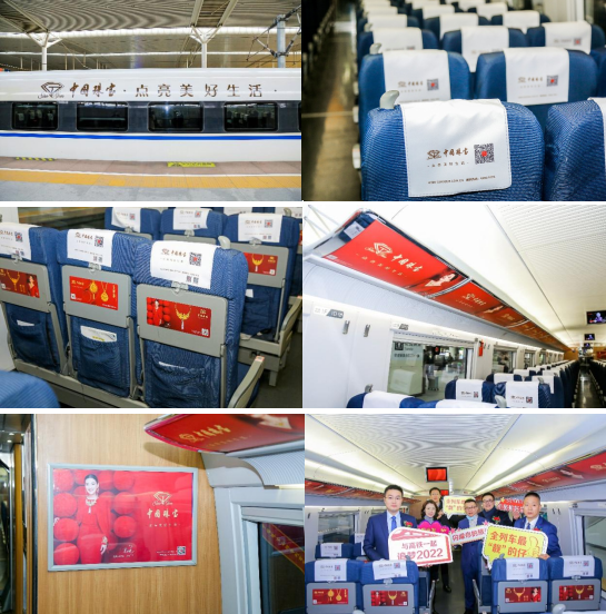 “中国珠宝”高铁品牌专列采用“文字+图像+声音”的三重立体传播形式,将品牌广告语、视频广告、海报等多元形象融入车身、玻璃门、小桌板、行李架、LED滚动屏、到站提示广播等的列车全部细节,实现了品牌在高铁列车的全面贯穿,让顾客沉浸式感受品牌形象,拉近了品牌与消费者的距离。同期,中国珠宝的品牌视频广告在广州局全线400多个车次的车厢内滚动播放,涵盖了广州铁路局发车的全部车次,覆盖了大江南北。