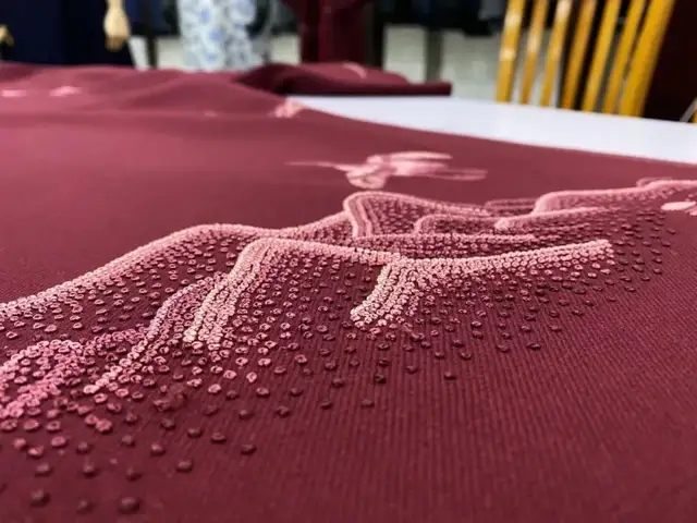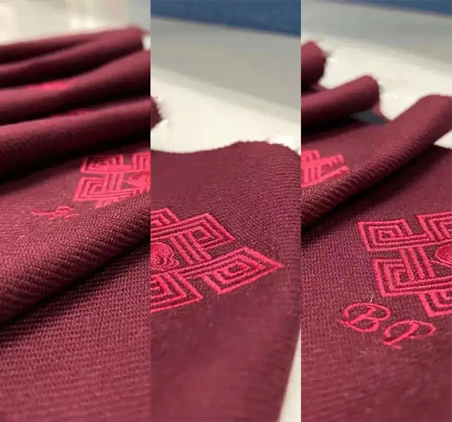 该中式礼服系列的设计过程中,修改方案总共达十余次,共计84套方案,根据方案开发了38款面料,服装上的绣花从开始的机绣、法式绣,到最终采用具有“平、齐、细、密、和、光、顺、匀”特点的“苏绣”工艺。每一套服装均为量身定做,通过细腻的针法,将穿着者名字的英文缩写绣在服装的后领贴处,在强调科技创新的现代化运用同时,体现东方文化“以人为本”的匠人手作,传递富有温度的国家情谊。