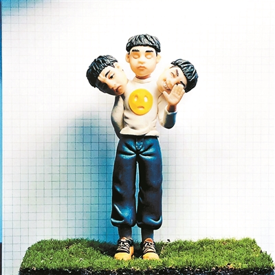 回顾本科毕业时的逆境,郎佳子彧至今都很感慨,“那段时间是我特别黑暗的时期。”但这段黑暗时期,也给他面人的创作带来不少灵感。现今令郎佳子彧最满意的一个作品也正是黑暗时期的作品,他捏了一个“三个头”的自己。为什么给自己捏了三个头?“因为当时我意识到自己情绪有问题,考试失利、失恋等等。在这个形象里,中间那个是‘平和’,左边那个是‘很难过’,右边那个是‘很开心’,当时我想找到和自己情绪共存的一个状态。”郎佳子彧说:“有时候情绪也是有力量的。”