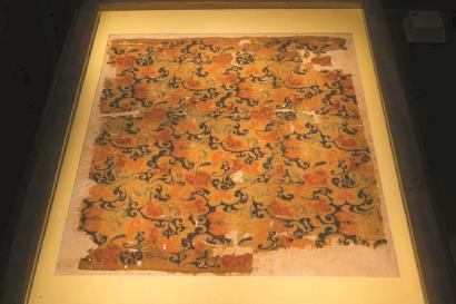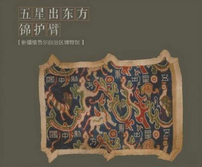 从丝绸作为重要物资的对外交流来看,在西域以及更西边的世界中,都留下了汉式经锦多彩的印记。秦汉时期,帝王特别重视祭天地仪式,秦始皇、汉武帝等都曾登临泰山举行过封禅大典,因此汉锦上也以超凡脱俗的云气和珍禽异兽形象彰显时代特征。汉式“云气动物纹锦”有相对固定的色彩搭配和纹样组合,遵循阴阳五行学说的五色显花、连绵如山的云纹、现实或想象中的动物以及穿插其中的寄托美好愿望的铭文。如此精美且蕴含中国古典哲学核心思想的衣料也是不可替代的高档礼品选项。尼雅遗址高规格主墓中出土的“五星出东方利中国”锦,被制作成了当地人狩猎时必备的护膊,很有可能就是产自蜀地远行西域的经典之作。仔细一看,在这件织锦上游走于祥瑞云气间的还有鸵鸟、孔雀等非中原地区出产的动物。与之相近的时期,葡萄、猛兽捕猎等外来元素纹样也跃然绸上。丝路开通之后多方文化互通有无,交相辉映的盛况时见一斑。