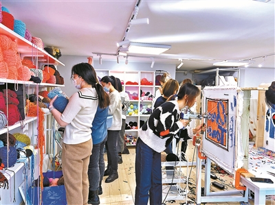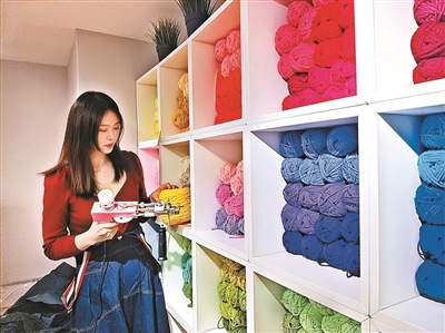 工作日的下午,北京青年报记者来到位于朝阳大悦城青年公社公寓楼内“玩个毛线·Tufting工坊”。这间工作室是个二层小阁楼,共有22个织布工位,二层楼的两面墙摆放着五颜六色的毛线,一层的布板上还有一个未完成的作品。“这人要打一个麻将‘發’字,还没打完,镜像投反了,看她什么时候再来做了。”店家解释说。
