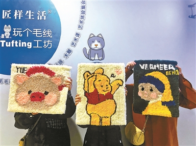 “每个周末几乎全部爆满”“顾客多是20多岁的年轻人”“情侣闺蜜来玩的最多”……刚营业两个多月的店家告诉北青报记者,不仅只是年轻人爱上“扎毛线”,甚至Tufting已经成为公司单位团建的一个时尚新方式。“三八妇女节的团建活动,我们这很早就约满了。因为制作起来不难,啥都能‘突突突’,给自己做个小地垫、坐垫、杯垫的,还能做个包包,很有新意。”店家兴奋地说。