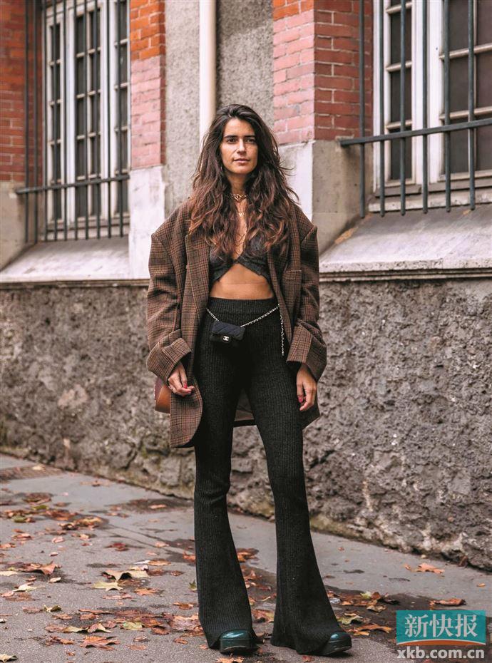 不过在选择拖地款喇叭裤时,要注意胯部及以下不宜过度紧绷,最好能顺着胯骨竖直而下,到小腿部分再打开成“喇叭”。
