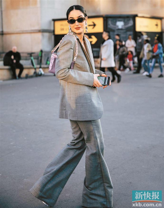 今年流行的喇叭裤长度偏长甚至拖地,与廓形感同样强烈的西装成套搭配,妥妥的“大女主”风,气场与裤长同高。