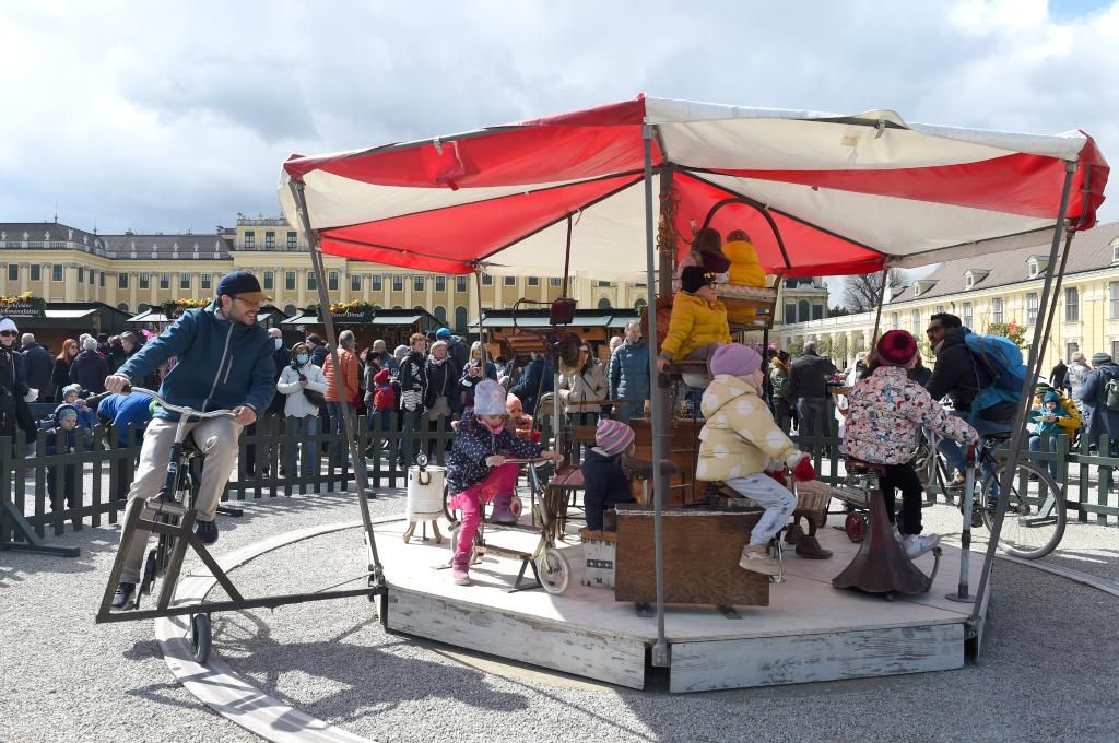 4月10日,孩子们在奥地利维也纳美泉宫复活节市场游玩。
