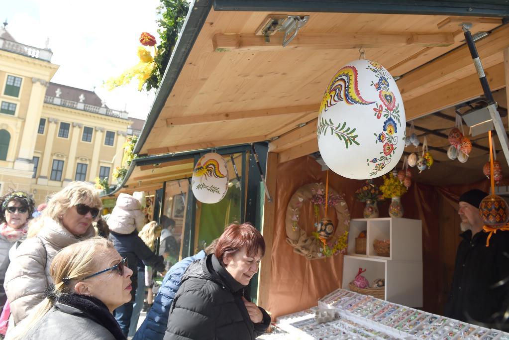 4月10日,人们在奥地利维也纳美泉宫复活节市场选购彩蛋。