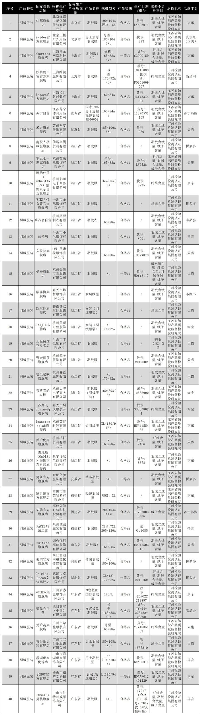 2021年网售羽绒服装质量国家监督抽查不合格产品及企业名单