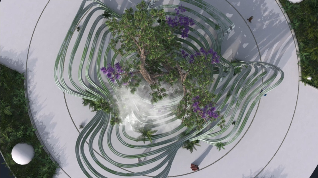 心咚科技将2022中国国际大学生时装周的视觉标识——“水晶”进行延伸设计,通过闭环的几何装置和环形水系来表现“无限循环”的概念,以此诠释“元•创东方”主题中“元”的循环美学深意。