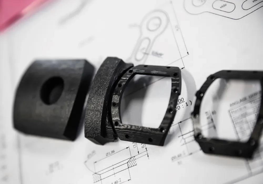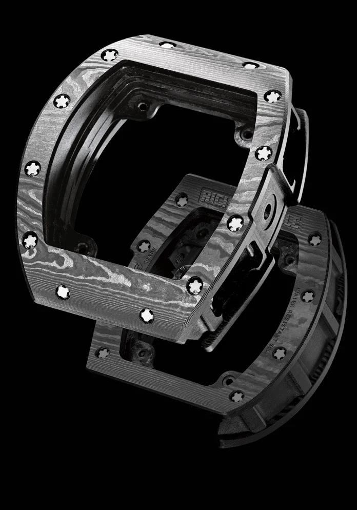 这种材料会产生独特的纹理,原因就在于第2步,这样一层一层变换角度的叠放,在切割后自然会显露出波浪状的涟漪。为了能加工这种表壳,RM重新调整了自己的设备、工艺和工序。它的硬度颇高,常规设备难以加工,需要特定研发的工具来打造出造型别致又符合人体工学的弧度。而且RM 35-03的表壳上有复杂的凹槽,这固然提高了表壳的视觉效果、降低了重量,但在这样坚固的材质上挖孔,也让加工难度和工时又上了一个台阶。