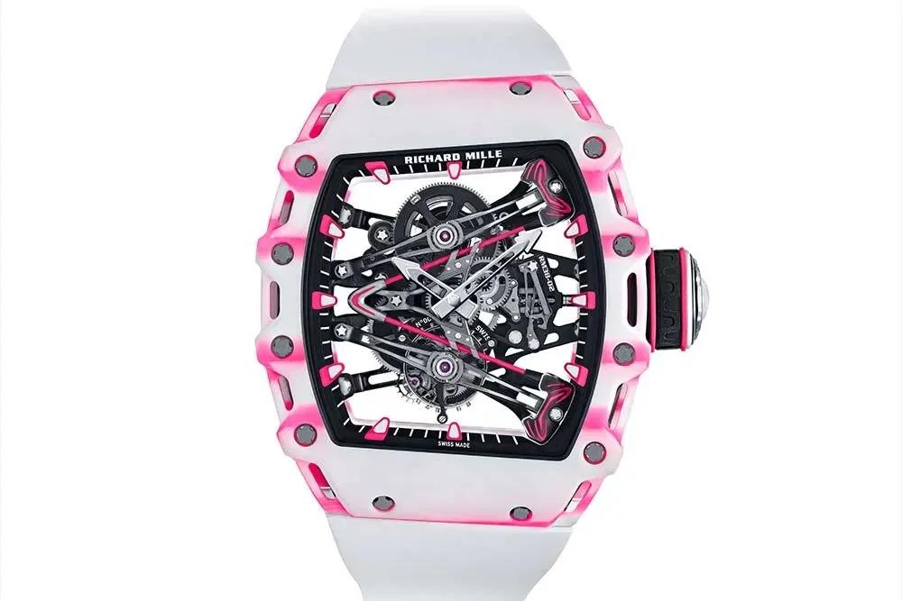 巴巴是高尔夫球场上的个性名将,除了五次赢得巡回赛锦标之外,在球场上他最吸引人注意的就是鲜亮的粉红色球杆和反手击球姿势,而且他也喜欢戴着表参加比赛。RICHARD MILLE最近为他推出了限量50枚的RM 38-02 Bubba Watson 陀飞轮腕表,表壳遵照了巴巴在最近十年里的心愿,终于成功地做成了粉红色。而且这枚腕表可以承受不低于10,000g的冲击力,以应对腕表在高尔夫运动中急停和剧烈加速所造成的压力。