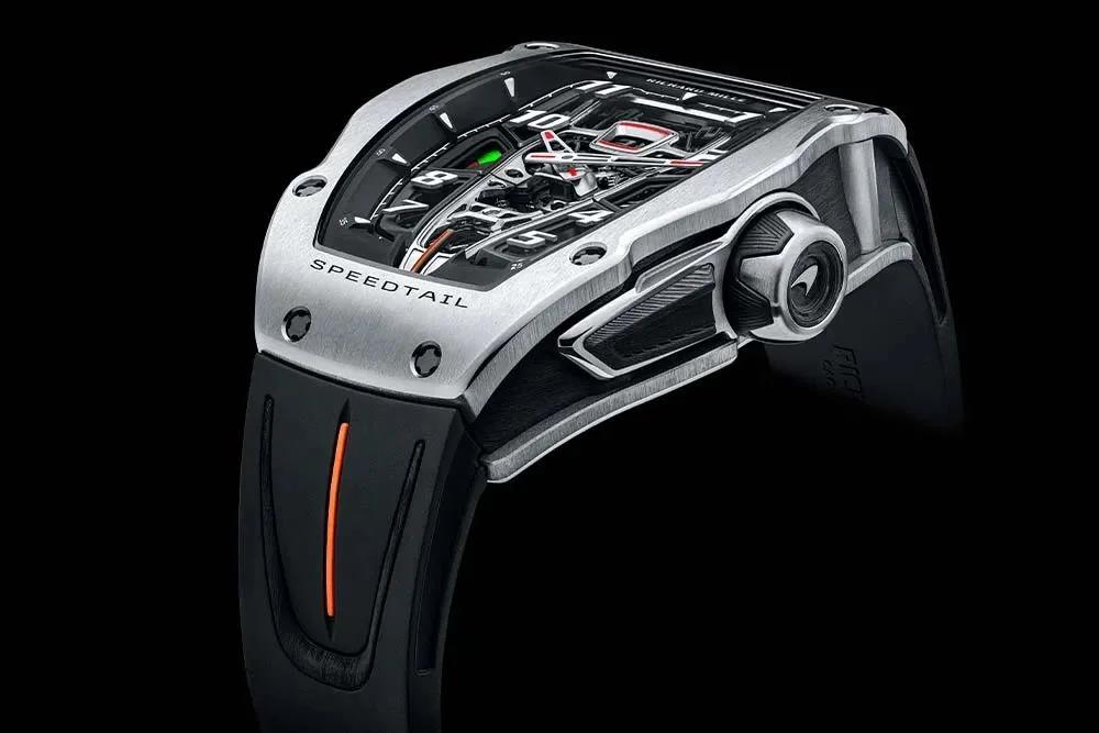这款腕表限量106枚,和迈凯伦的最快公路跑车Speedtail限量106辆相呼应。它的设计参照了Speedtail跑车符合空气动力学的“水滴型”车身,表壳在RM家族中显得与众不同,曲线修长而流畅,科技感强烈。表圈两侧的凹槽呼应了跑车引擎盖的开孔,精致优雅。
