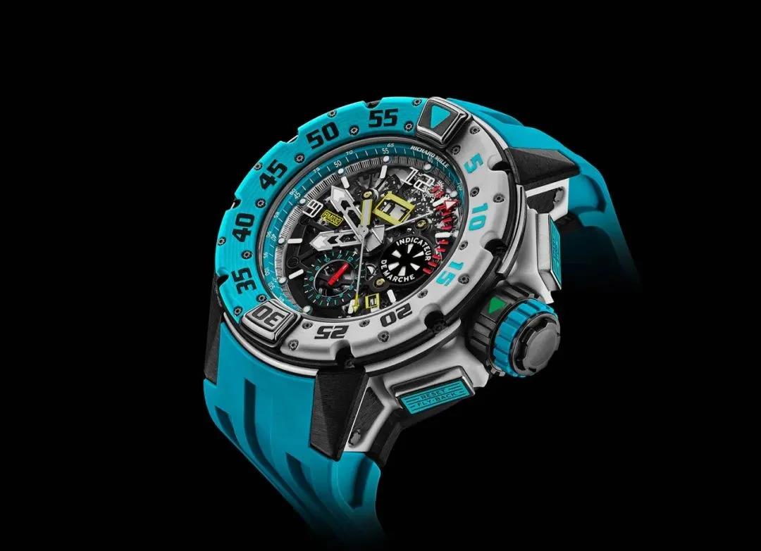 除了这些在壳型、色彩上引人注目的款式,RM也会根据腕表的用途来调整壳型。就像RM 032自动上链潜水计时码表圣巴托帆船赛款的圆形表壳,却又有着独特的功能和色彩。