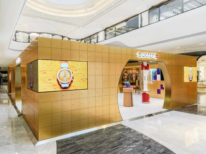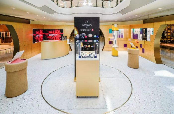 为了让消费者获得更好的体验,本次BIOCERAMIC MoonSwatch系列快闪店内特别铺设了代表星球色彩的地面装饰,MoonSwatch展示区地台饰面则高度还原月球表面地貌,力求通过细节设计,让消费者能够沉浸式观赏并试戴全新腕表系列。