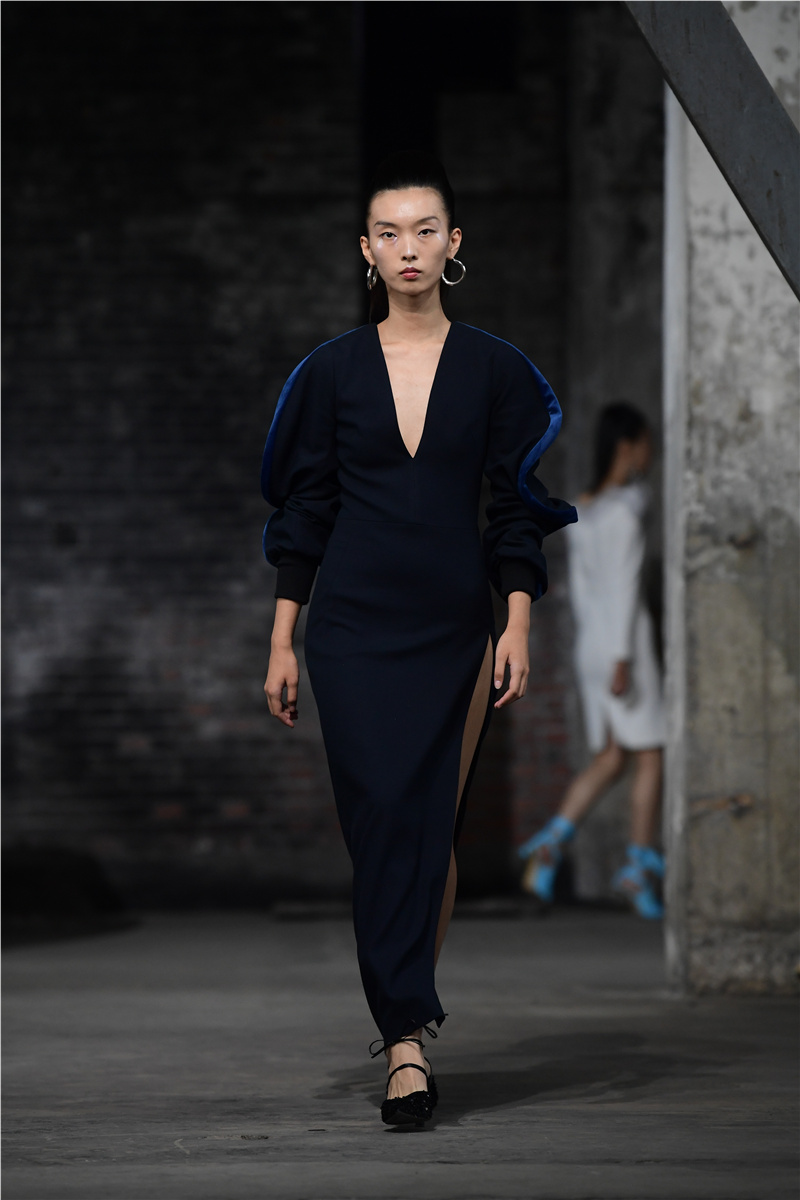 在设计细节上,云朵概念作为主线,演变出三个层次;礼服系列中云朵印花上身,错觉把天空带到眼前;时尚系列中云朵⽴裁造型加强时装风格,刻意显现比例失调的头重脚轻之感;商务系列中以⽩⾊线条重述云朵主题。云朵意向始终贯穿三组系列,具体与抽象结合,艺铭通过这一系列设计语言,表达主题“所见⾮见”,希望观者可以看到⾃⼰想看的世界。