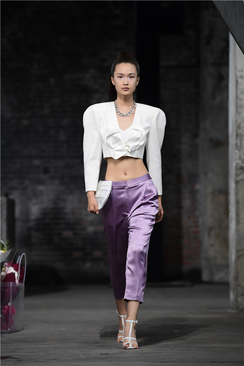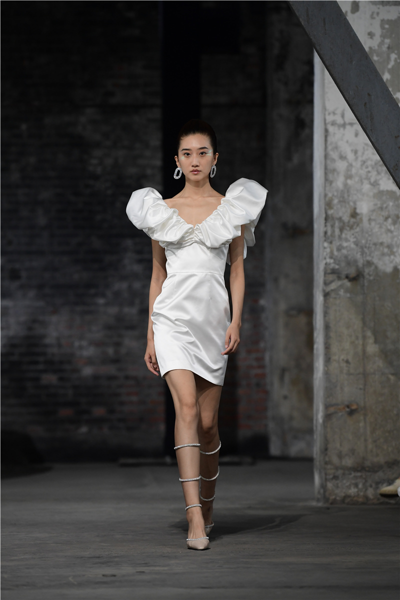 本次发布会服装的廓形设计延续上⼀季 T 型的风格,更加浮夸膨⼤的袖⼦、立体的肩部结构,用硬挺的方式表达如“云朵”一般的柔软。