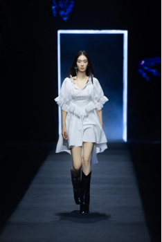 本季设计更具风格化,经过改良的古典弧型束腰,在保证美感的同时更加生活化;泡泡袖,羊腿袖,斯拉袖等袖型,凸显优雅。除此之还加入了中式斜襟,盘扣,苏绣、湘绣、双面绣等中国传统刺绣工艺,大胆的进行了一次中西的完美结合。